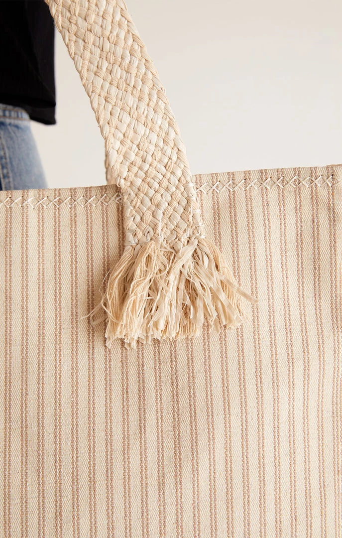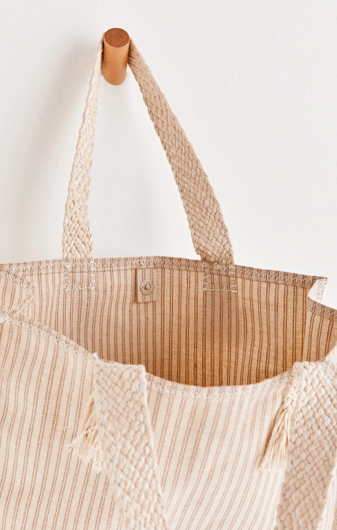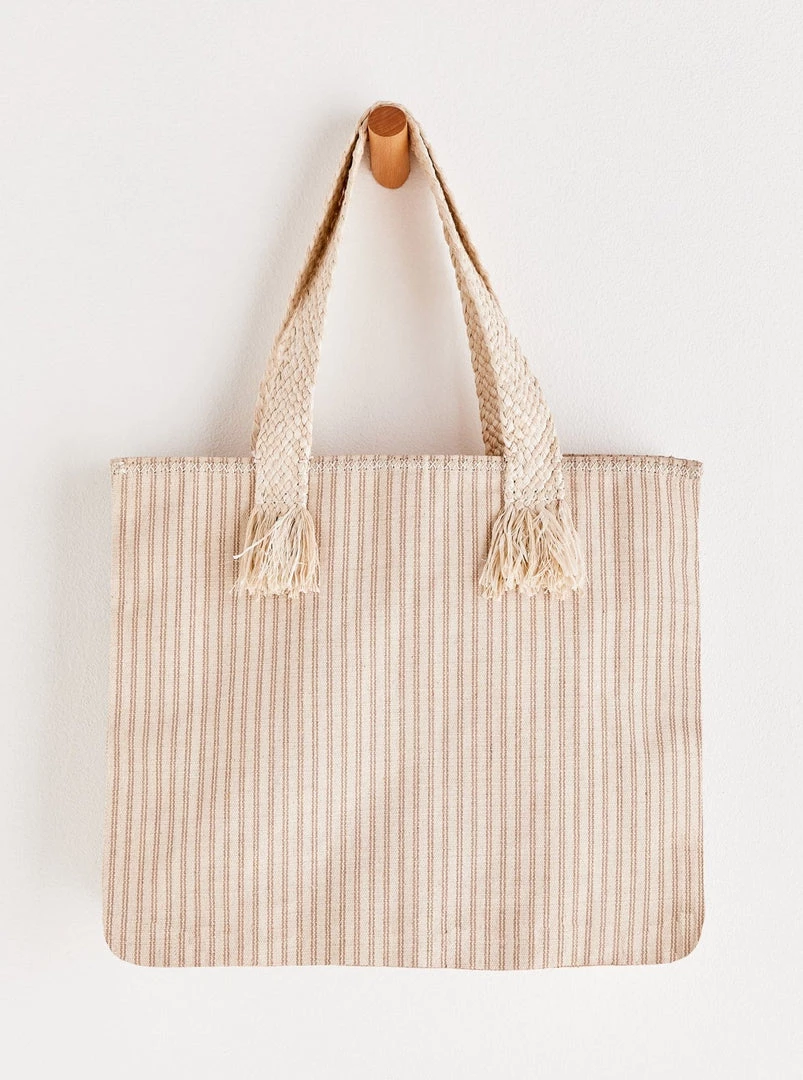 We’re so excited about our new tote bags! The cotton/linen Cabana Stripe Tote features braided handles and a laminated finish, making this bag a must-have accessory she’ll be reaching for all season. The classic taupe color gives it a timeless look, ensuring it will be a staple for seasons to come.Â
