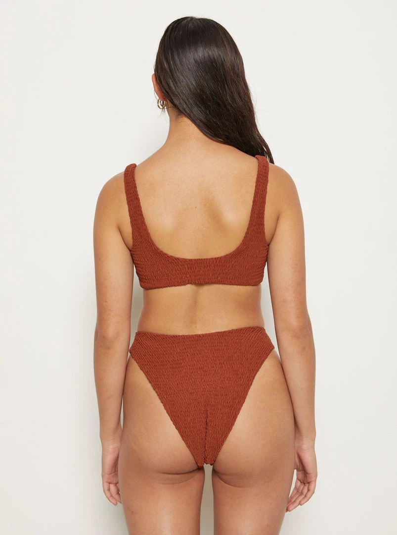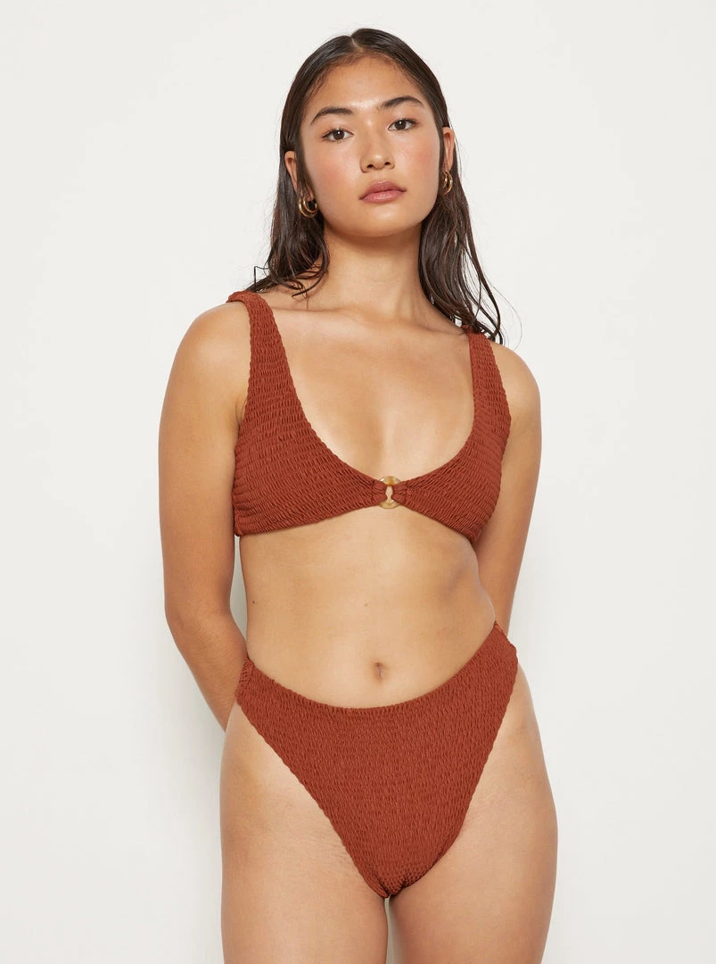 Lay out in this smocked bikini top with a flattering scoop neckline, chunky O-ring detail and wide shoulder straps. Hardware-free with a pull-on design. Made of sustainable swim fabric.