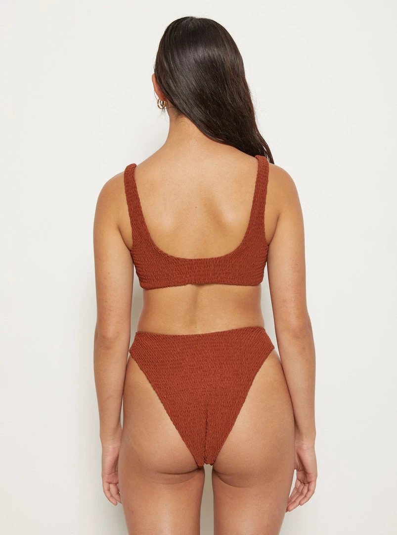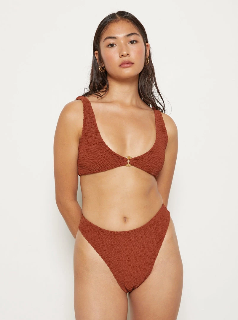 Smocked bikini bottoms from Aila Blue. Made from Econyl – a sustainable swim fabric made from recycled plastic found in the ocean.
