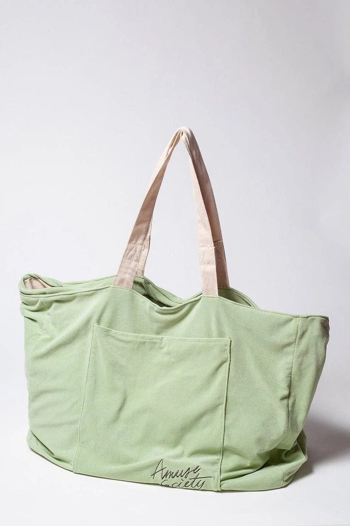 Terry tote bag with zip closure and embroidered logo at front patch pocket. Canvas lined and straps with tortoiseshell hardware.