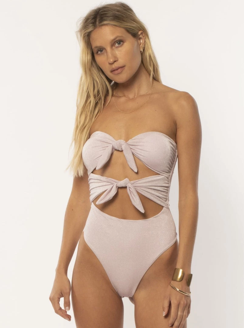 The Solid Belmond One Piece is a metallic shimmer one piece with a high leg high hip style. It is clean finished with two adjustable center front tie details. It has boning at side seams and clear sticky tape along the top interior edge. It is fully lined and has removable straps and removable pads.