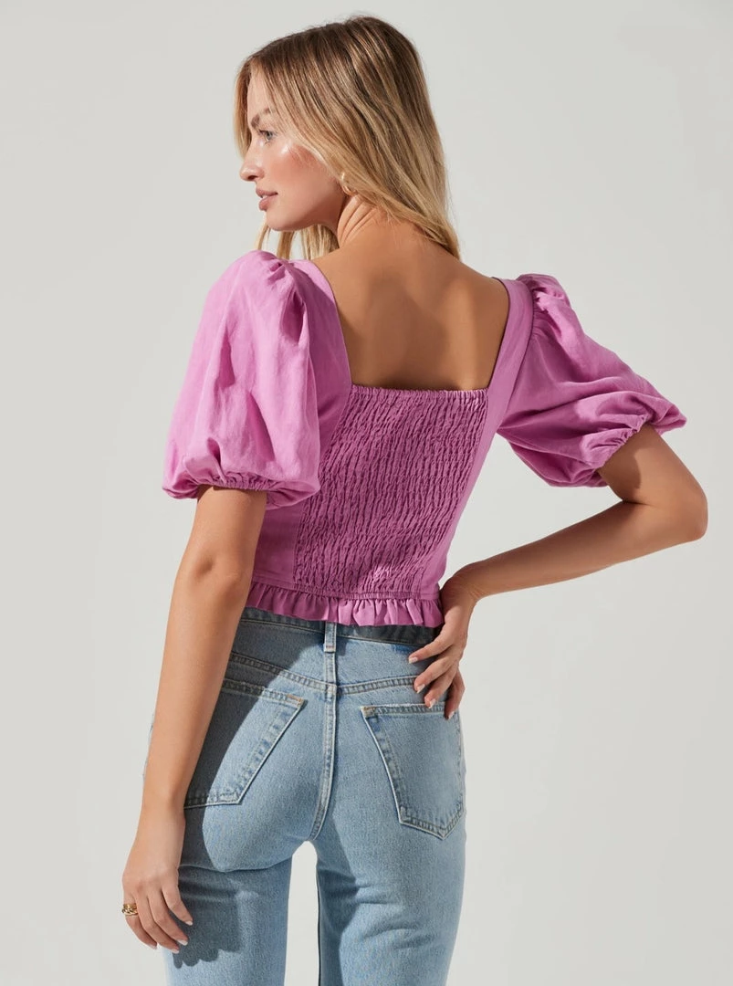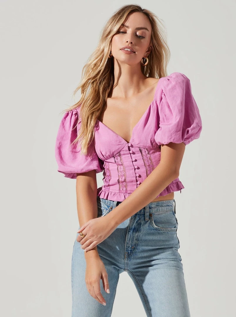 This romantic top features a sweetheart neckline that leads to a buttoned front and lace trim details throughout the bodice. Ruffle hem. Short puff sleeves. Smocked back. Concealed side zip closure.