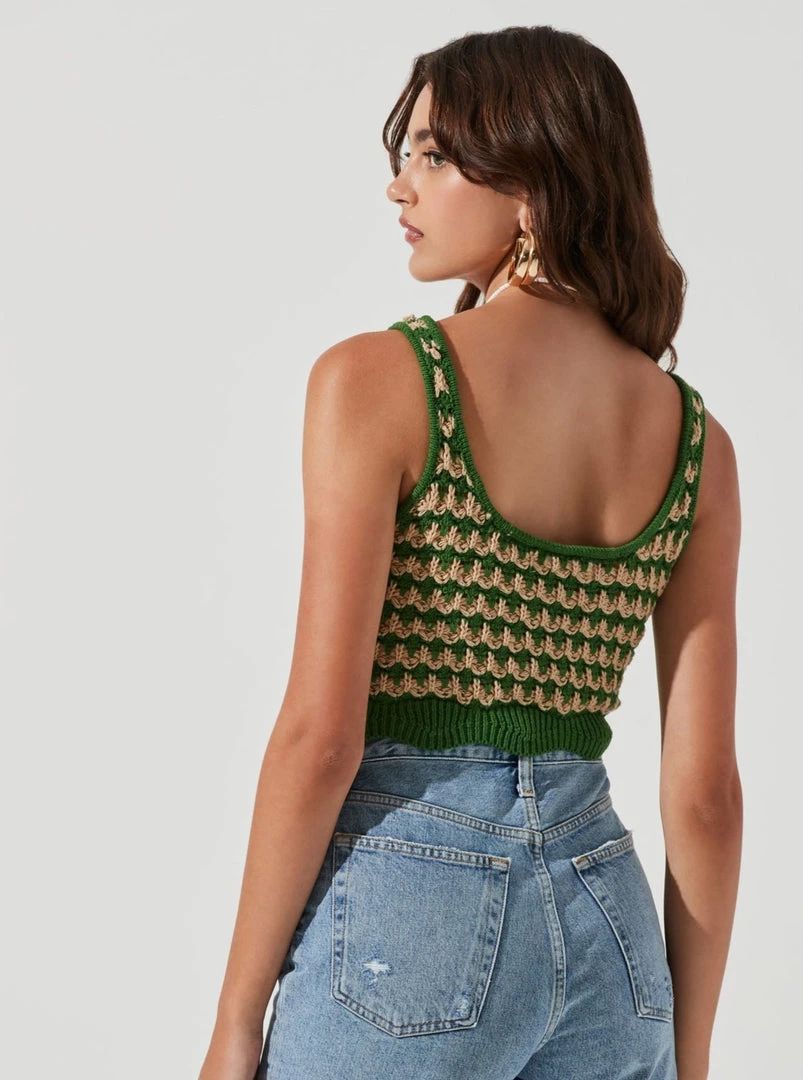 The Garber Top features a crochet knit construction with a scoop neckline that leads to a scalloped design throughout with a coordinating scalloped hem. Sleeveless.