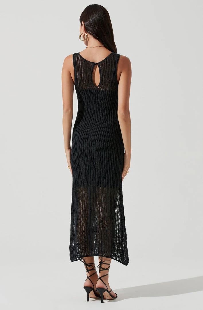The Palmer Dress features an open-weave crochet construction that starts with a crew neckline and leads to a partially-lined column silhouette. Sleeveless. Keyhole back.