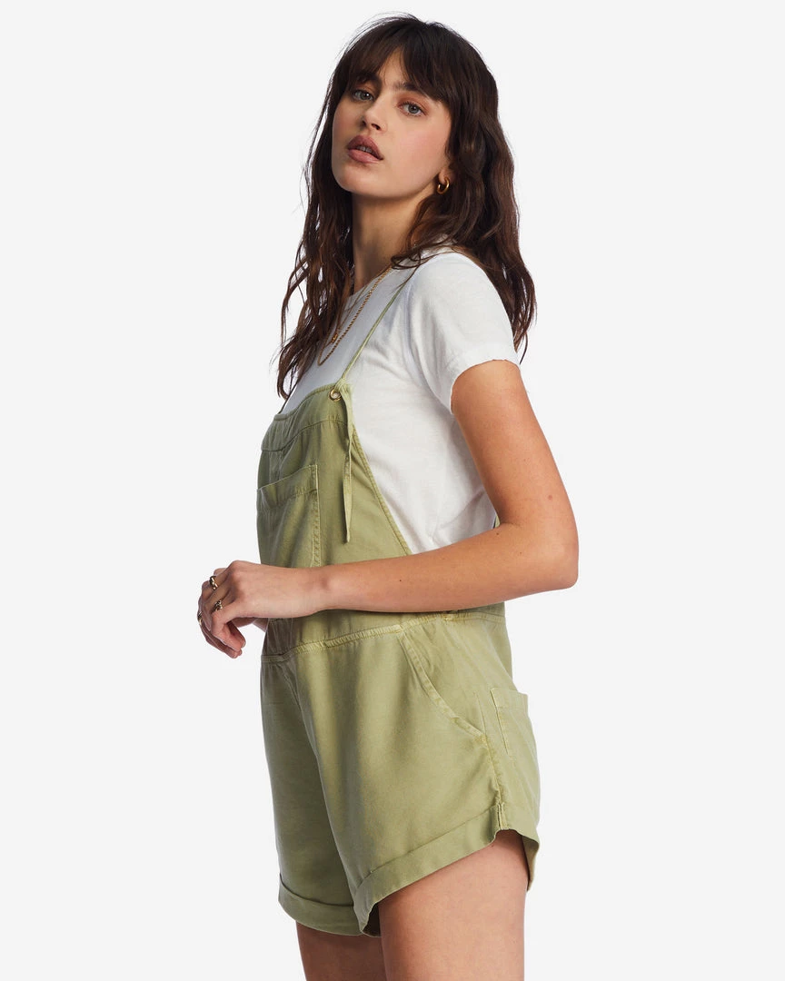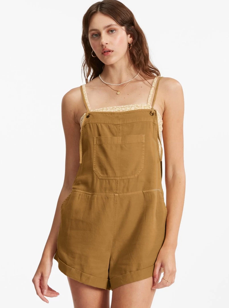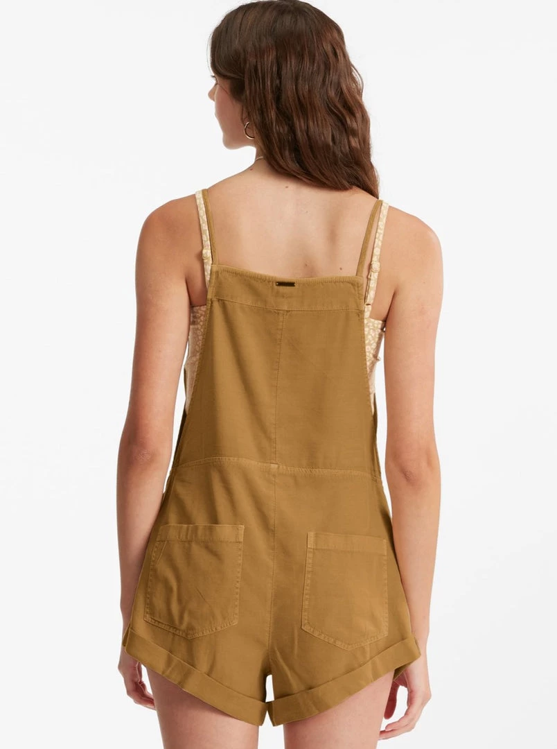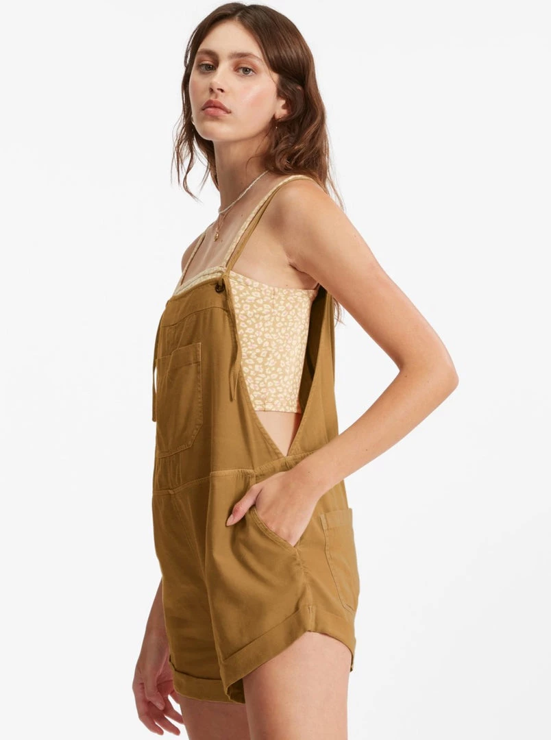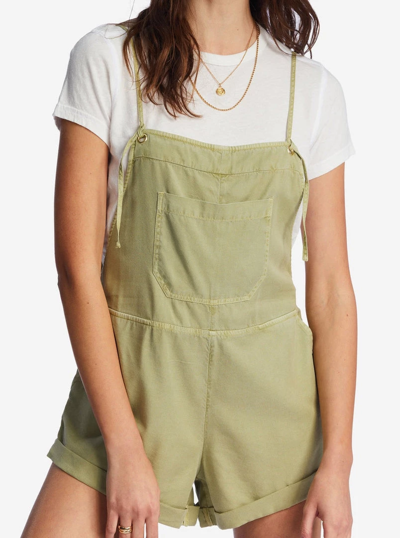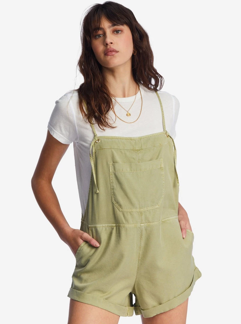 Play all day, dream all night. A laid-back take on the short overall, the Wild Pursuit features a vintage washed and well-worn woven fabric with classic overall pockets. A blend of playsuit and overalls, details include a rolled hem and thin straps that tie at the front.