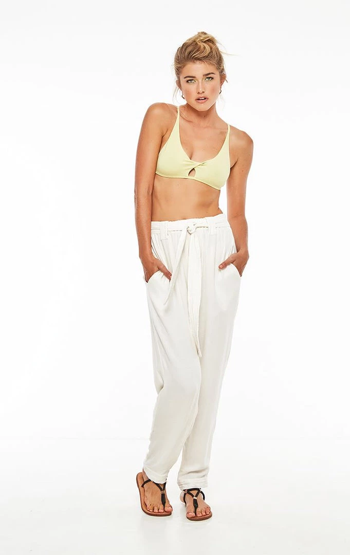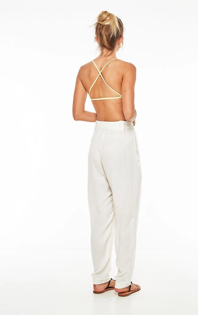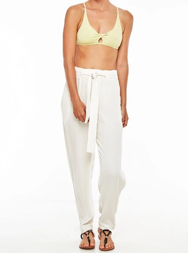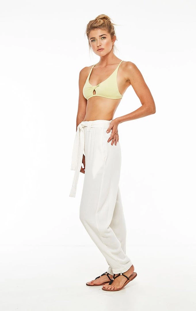 Solid lounge pant with judo-inspired sash, made with washed linen fabric.
