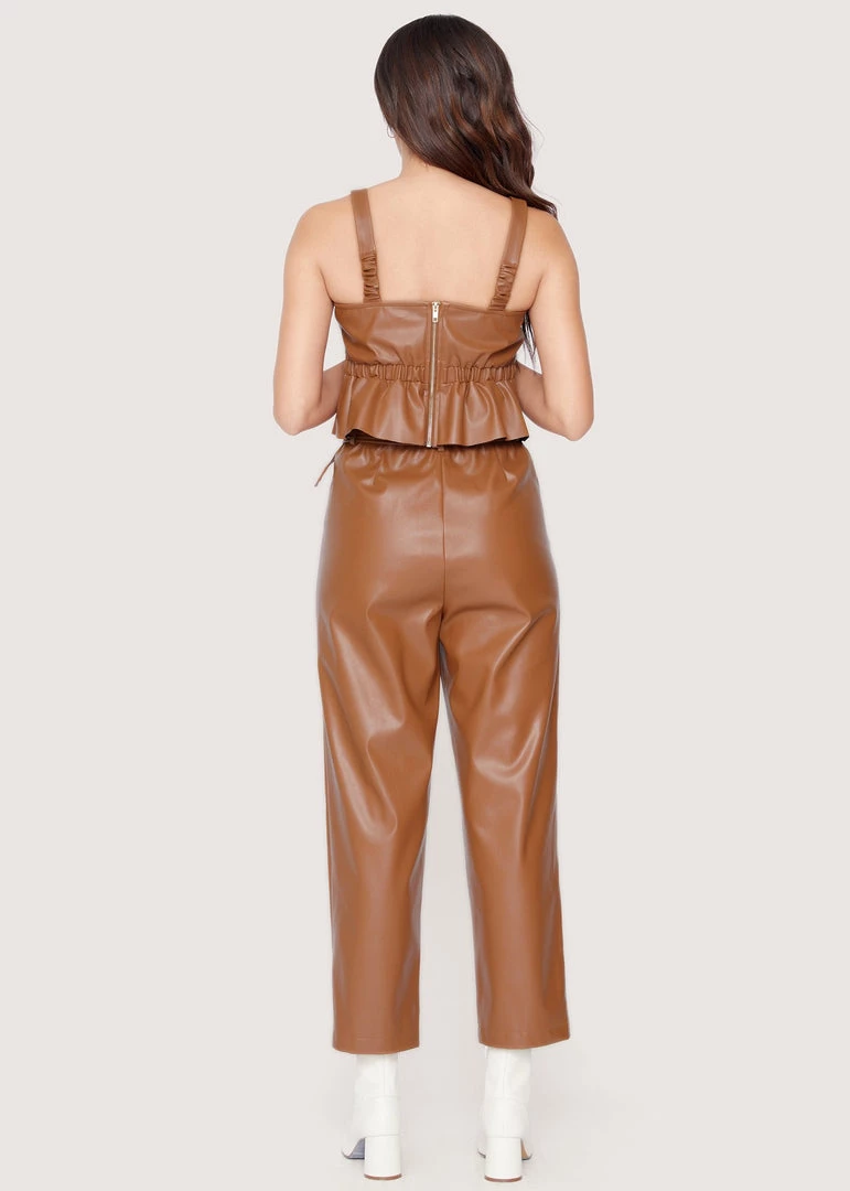 A great straight leg leather pants option for this season. The Set The Scene Pants feature an adjustable belt, high waist fit, and a beautiful brown leather. These pants will turn any outfit trendy.