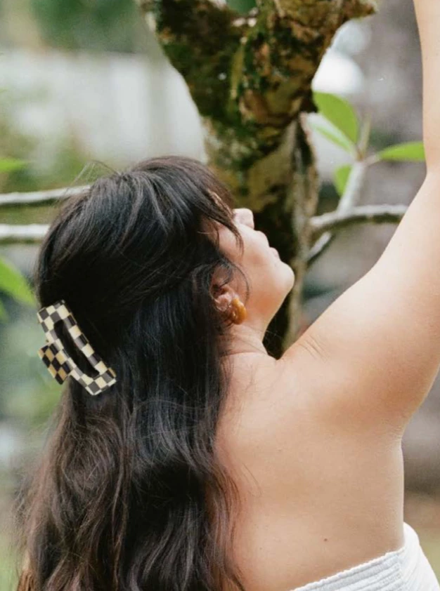 Check out our new claw, the Allegra. With a monochromatic check print in the acetate, the Allegra claw gives serious cool girl vibes.