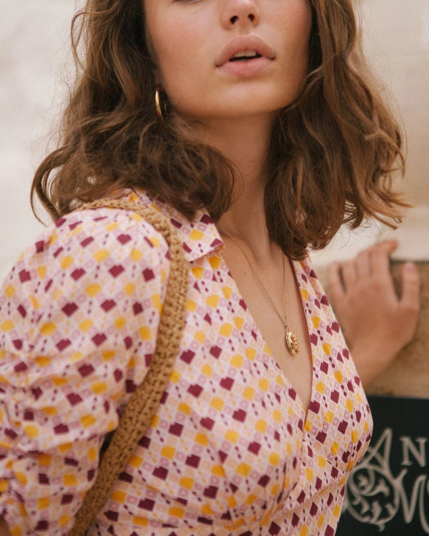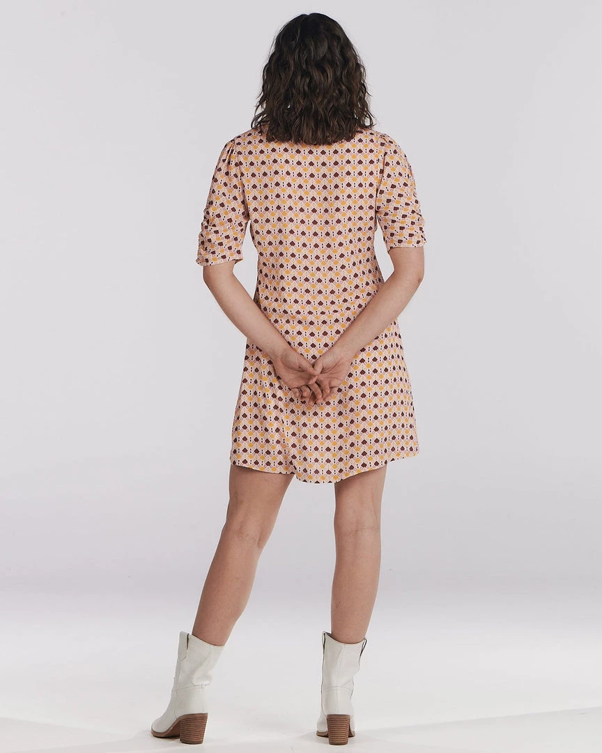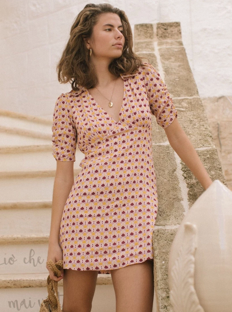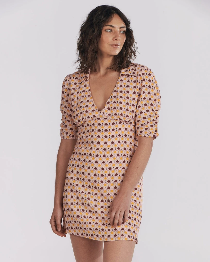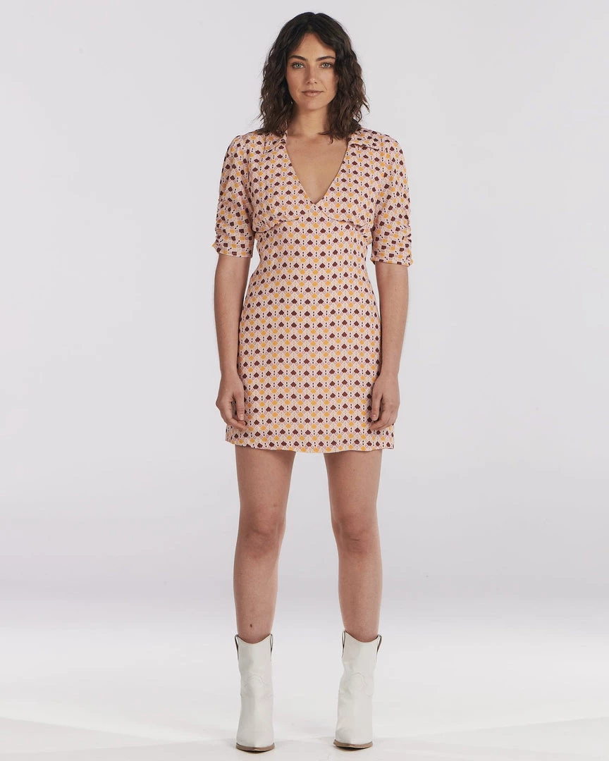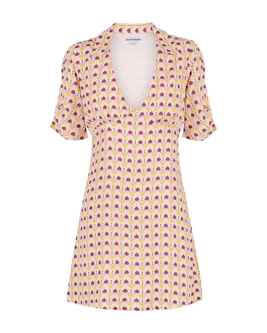 This retro-print mini-dress is tailored at the bust with a deep V neckline and wide collar. Wear it with ankle boots for a fun going-out look.