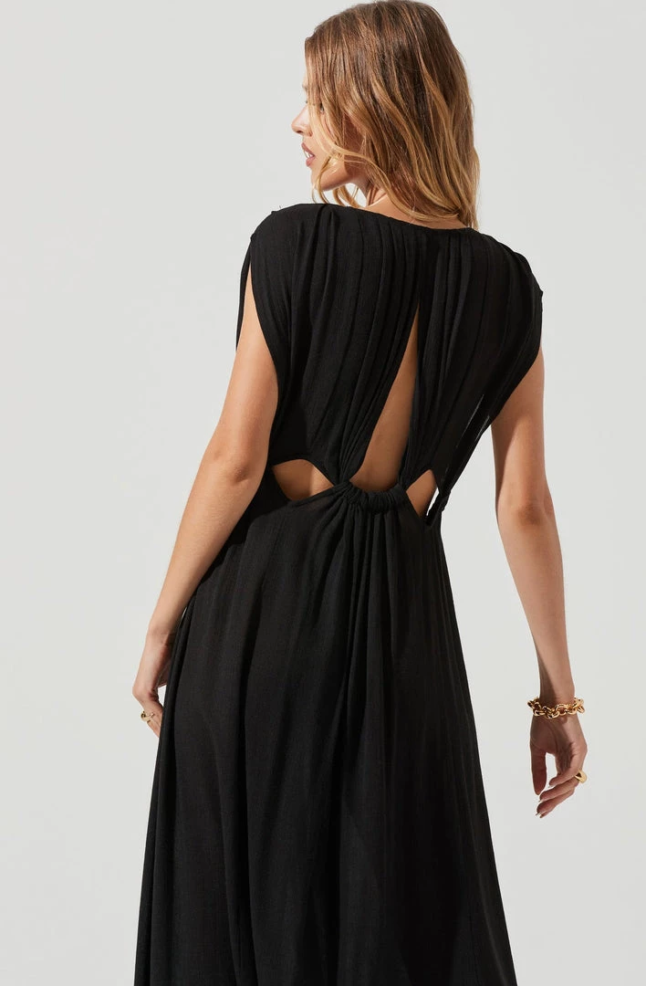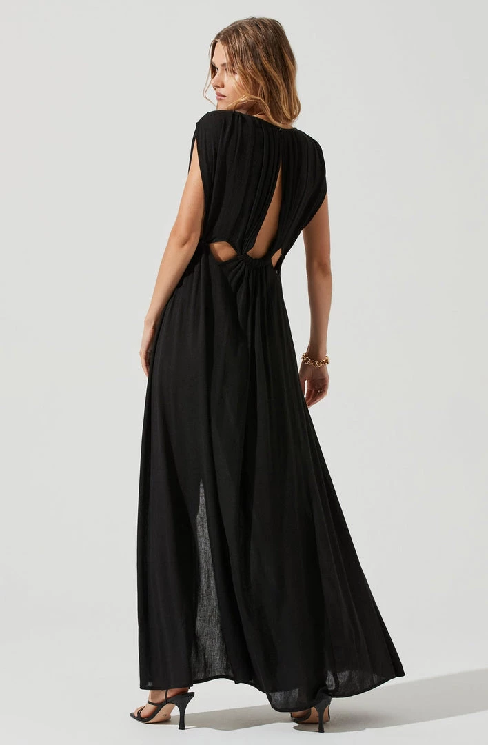 The Octavia Dress features a daring plunge neckline that leads to a midriff cutout design. Draped maxi skirt features a side slit accent. Keyhole back. Sleeveless.