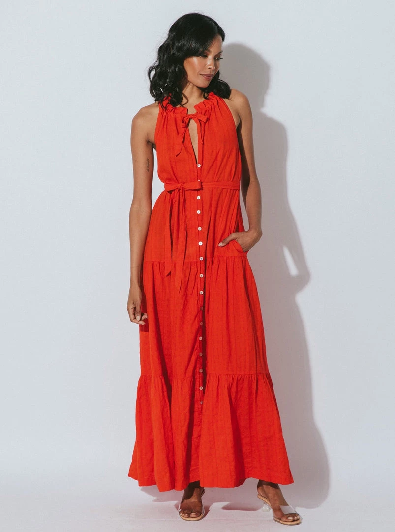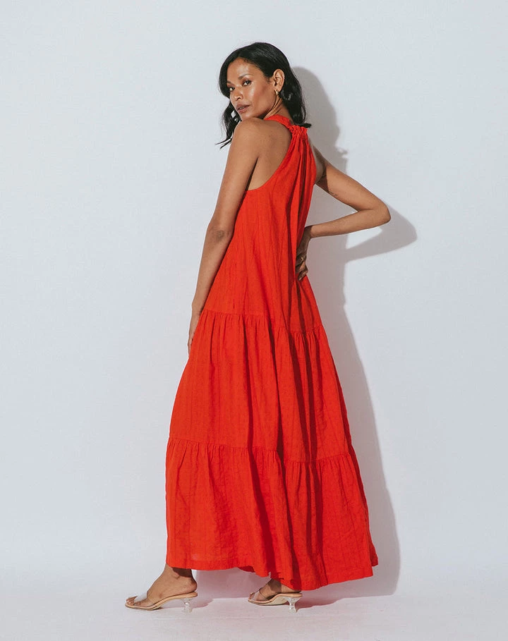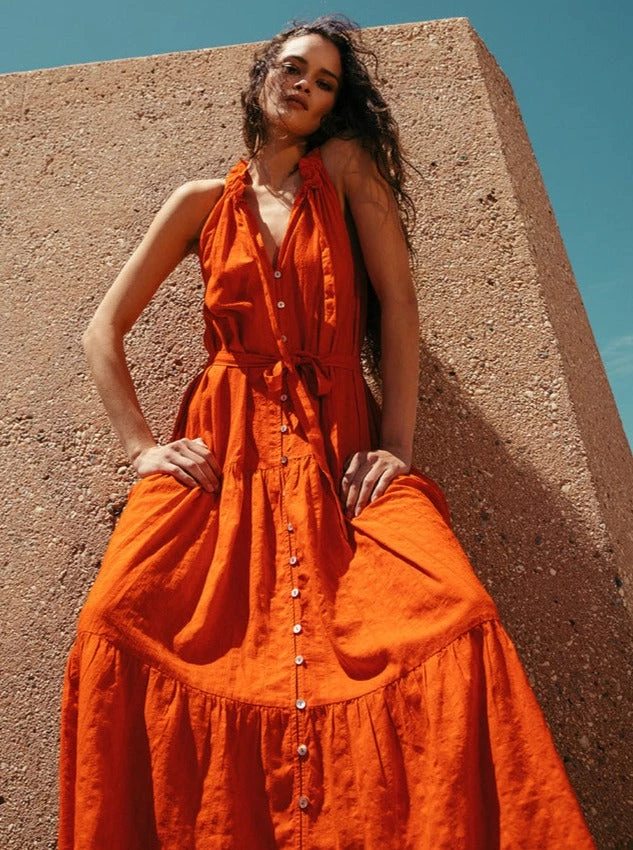 The Simone Ankle Dress is a show stopper this season. Beautiful high neck and open back with sash tie, this is THE dress for all your upcoming weddings, events, brunches, dinners, the list goes on!