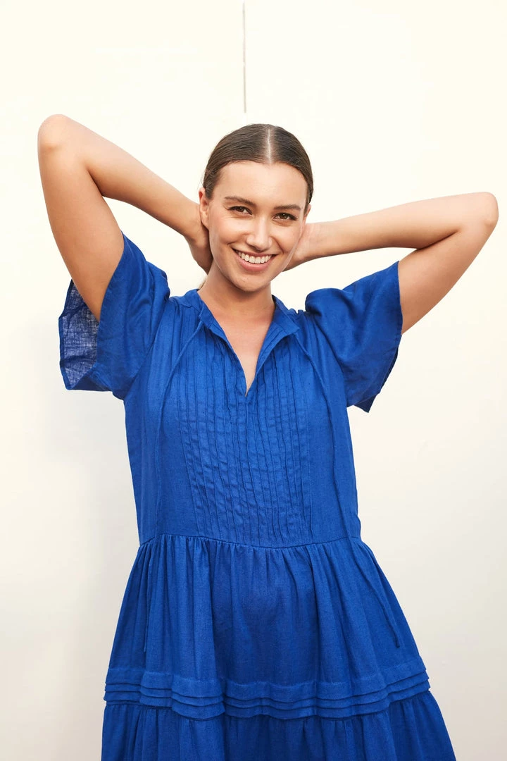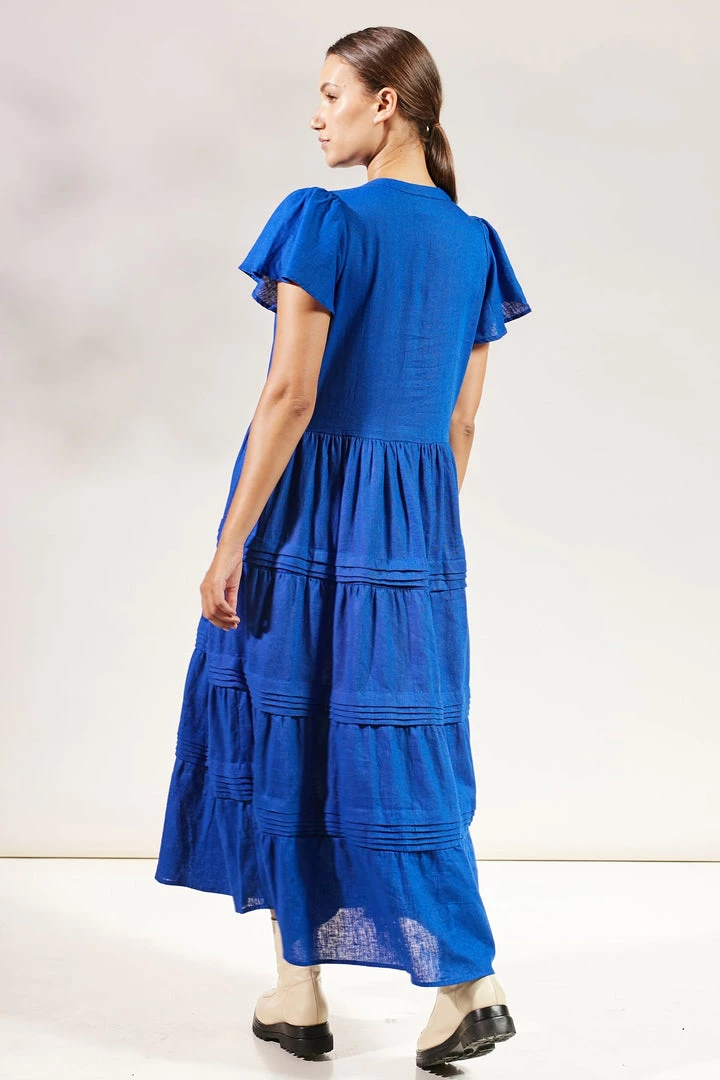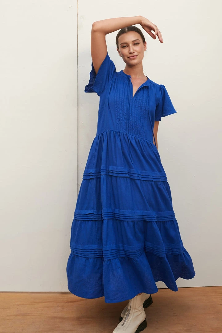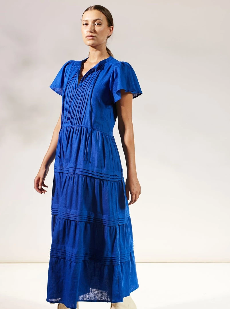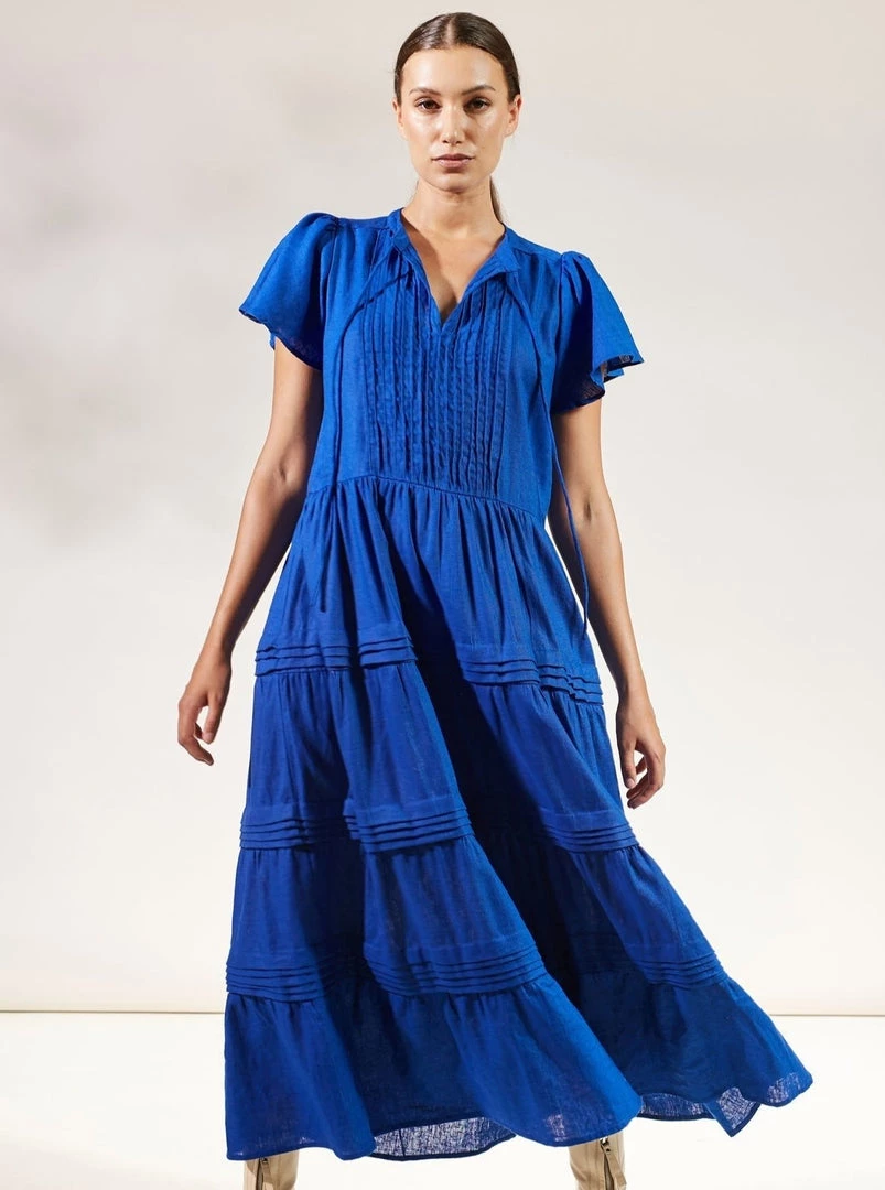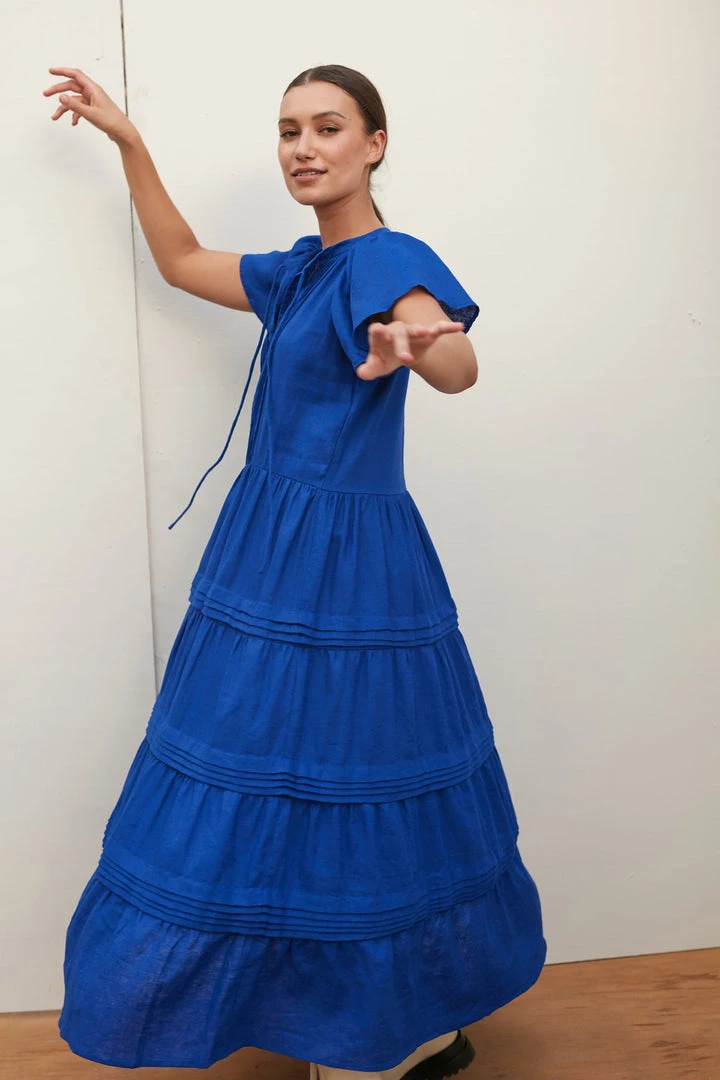Our signature Mila Maxi Dress is a modern maxi length dress with a flattering v shape neckline, layered skirt, pretty stitiching detailing and flowy short capped sleeves. Tie up the neckline for an elegant twist or leave undone for a casual chic look. However you choose to wear Mila, you’ll fall in love with her. Wear it on its own with statement boots, or layer under a jacket or cardigan with minimalist sandals.
