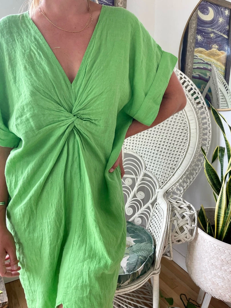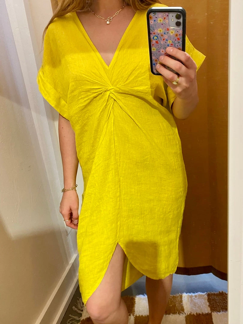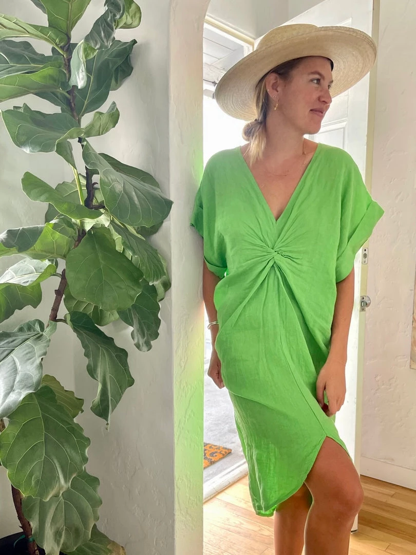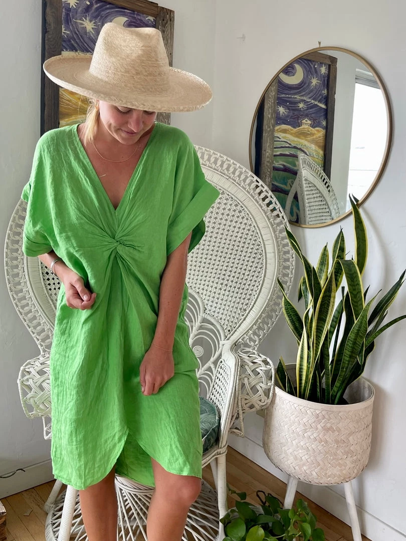 The Stevie is a woven knee-length coverup dress with twist detail at center, v-neckline, and short, kaftan-style sleeves. Available in 2 colors.