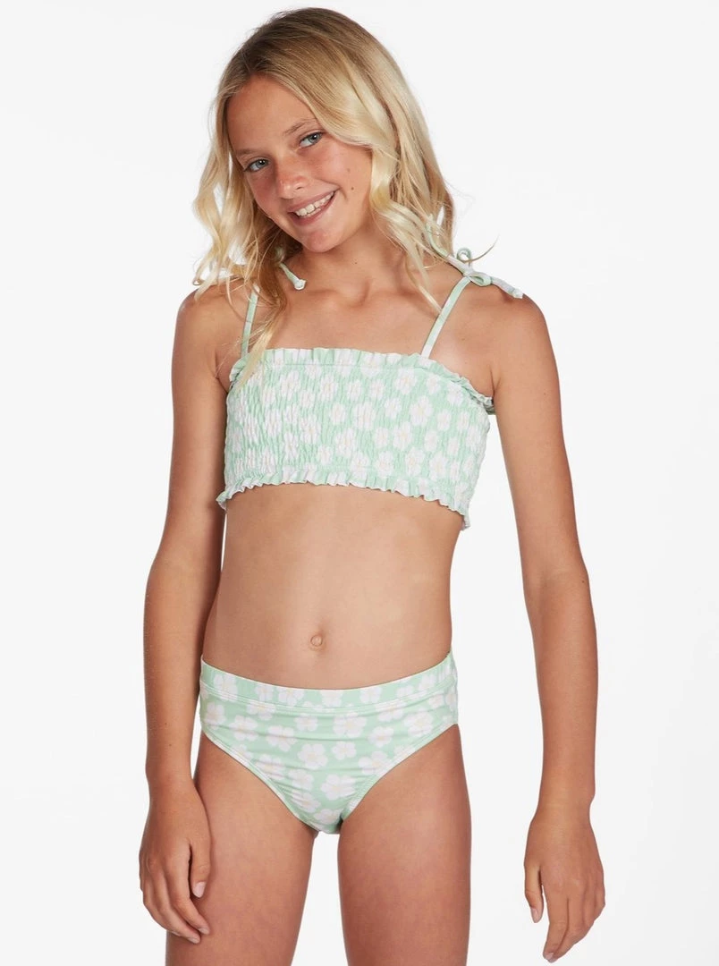 Made for fun in the sun and saltwater, the Girls’ Ditsy Love Smocked Top bikini set shines in a playful floral print made with stretchy fabric crafted from recycled poly. The set includes a full-coverage bottom and a smocked tube top with adjustable straps.