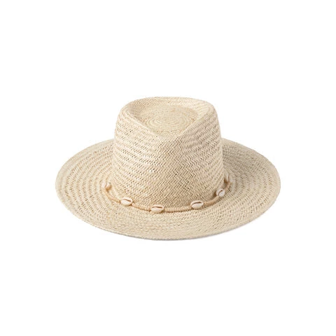 - Off-White 100% paper straw fedora trimmed with custom beaded seashell chin strap.