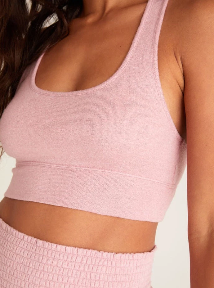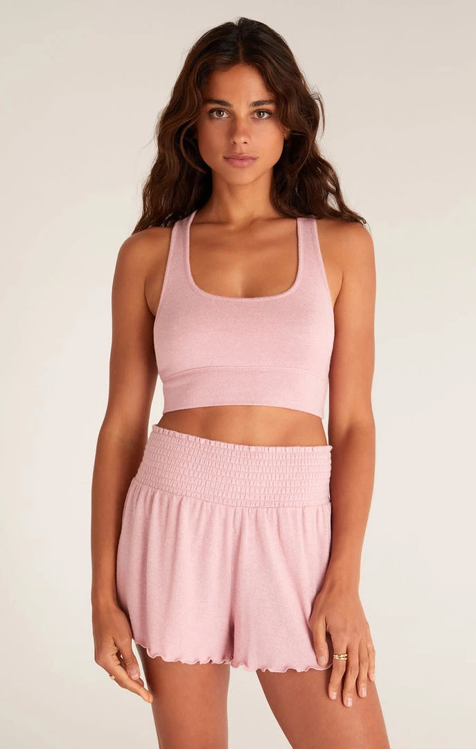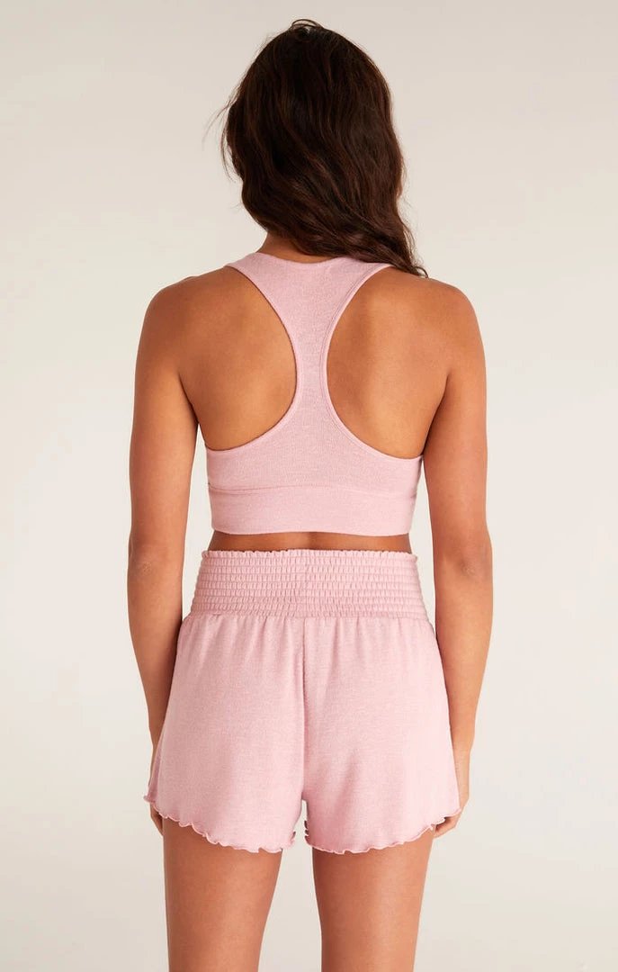 A Z Lounge staple, the Sia Slub Tank Bra is back for Summer ’22 in our pretty pink Azalea color. Made from a soft Slub Sweater Knit fabric, this racerback bralette is lightly supportive with an elastic band. Add the Dawn Smocked Short to complete the look.Â