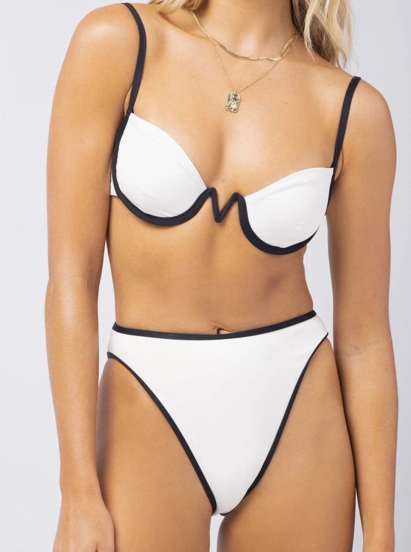 Designed to give you some structure to your day, the Nico Bikini Top is supported by an underwire that leads to a V shape center front, and comes with a demi cup along with a three point hook adjustment, adjustable straps, and contrast binding.