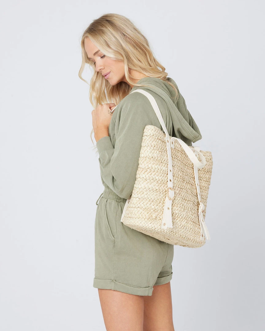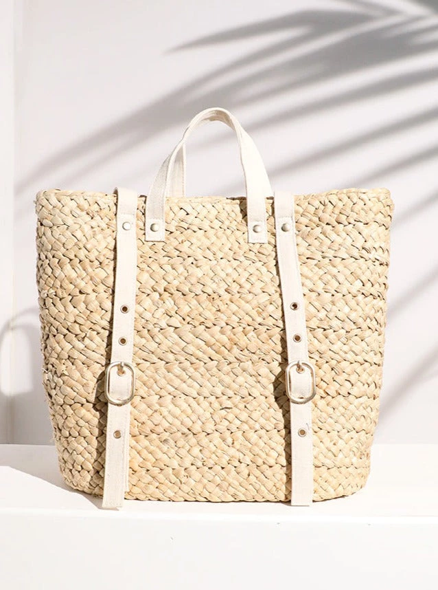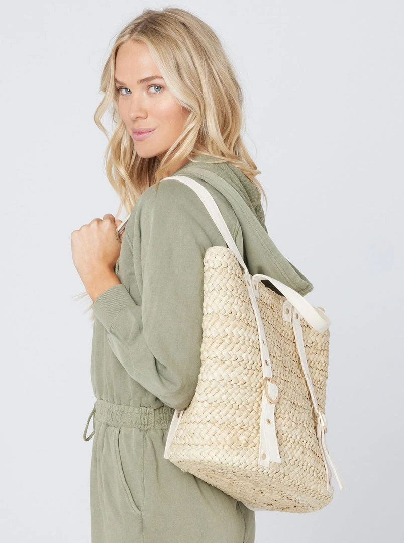 Finally, a commuter companion that carries it all! From farmers market finds to beach bound essentials, our straw tote-turned-backpack keeps everything beautifully intact from the canvas, towel bearing straps on the outside to drawcord closure inside.