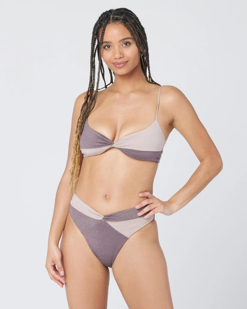 The Nancy Lee is a vintage-inspired bottom with shimmer color blocking and a twist front detail. This high waist style features a sexy high cut leg and bitsy coverage.