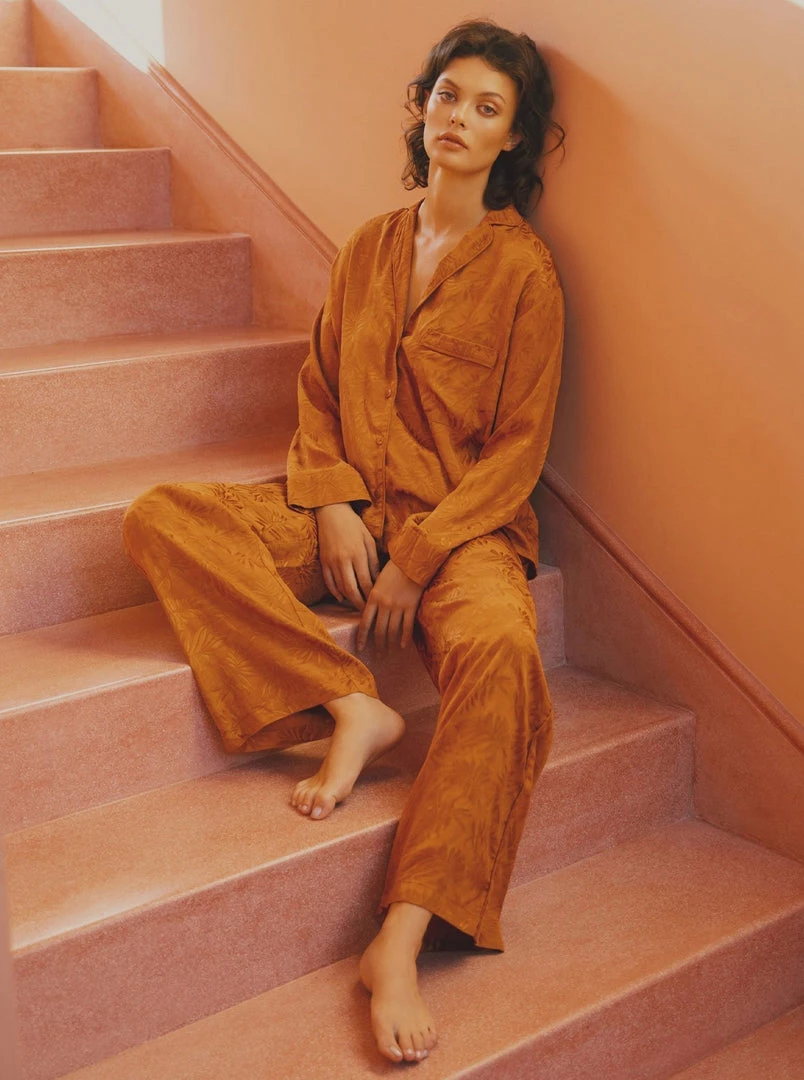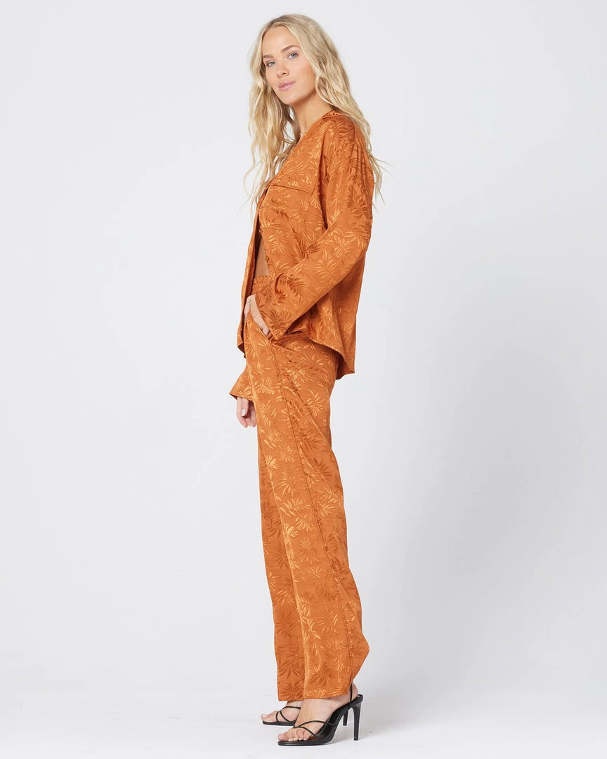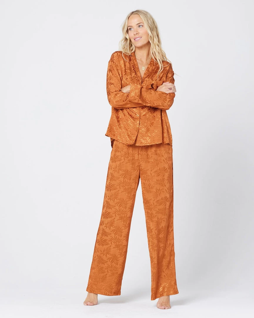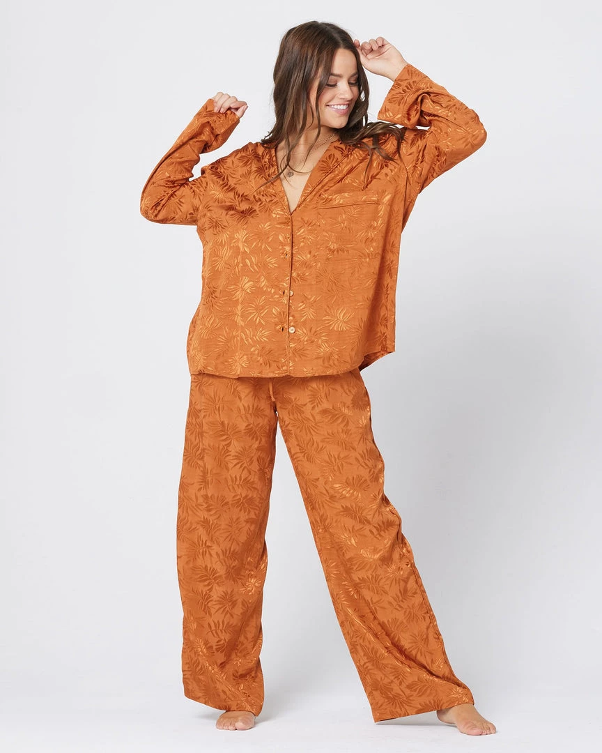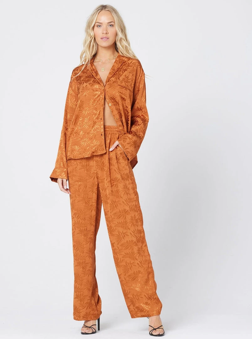 Drift away to sweet dreams of beach vacays and sunny days in the In Your Dreams Pajamas. This two-piece set is made in a silky palm printed fabric and features a button front top, elastic waist pant with self-tie drawcord, and side slant pockets.