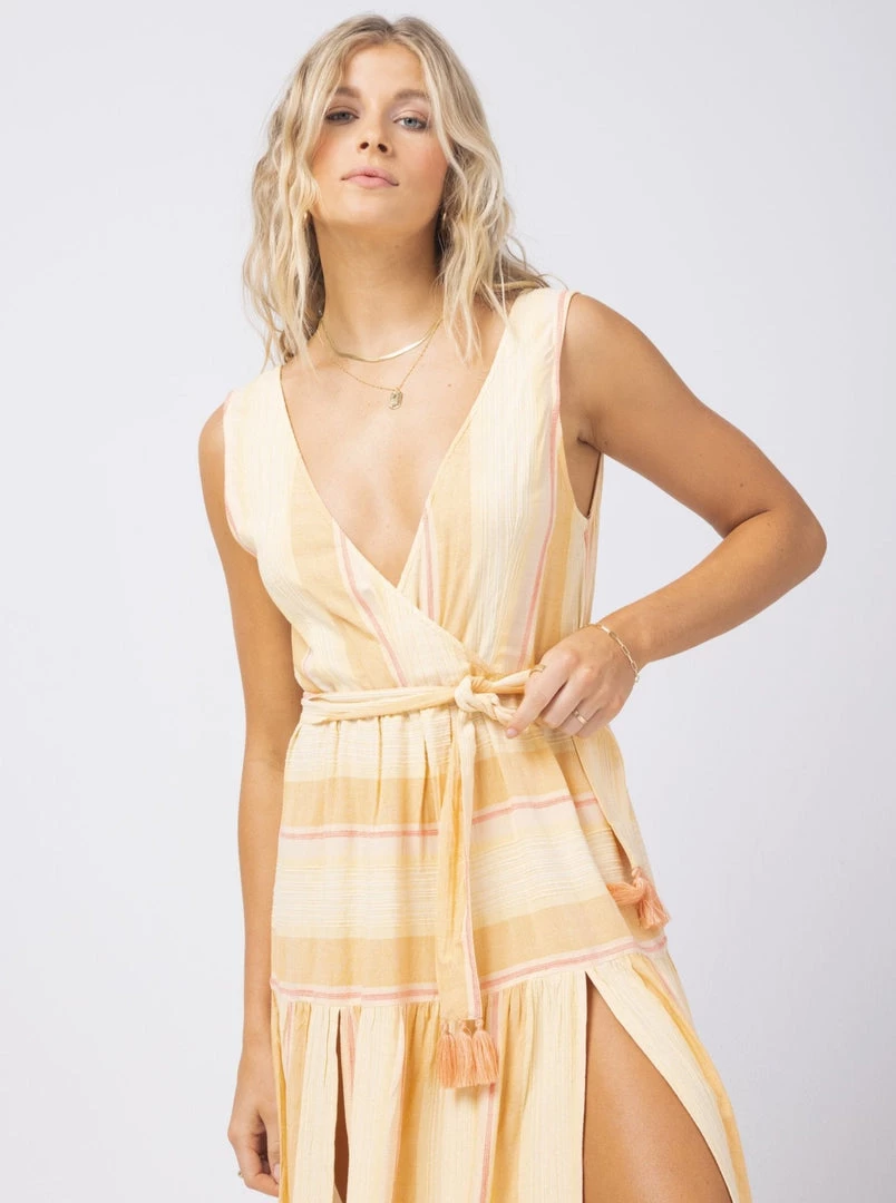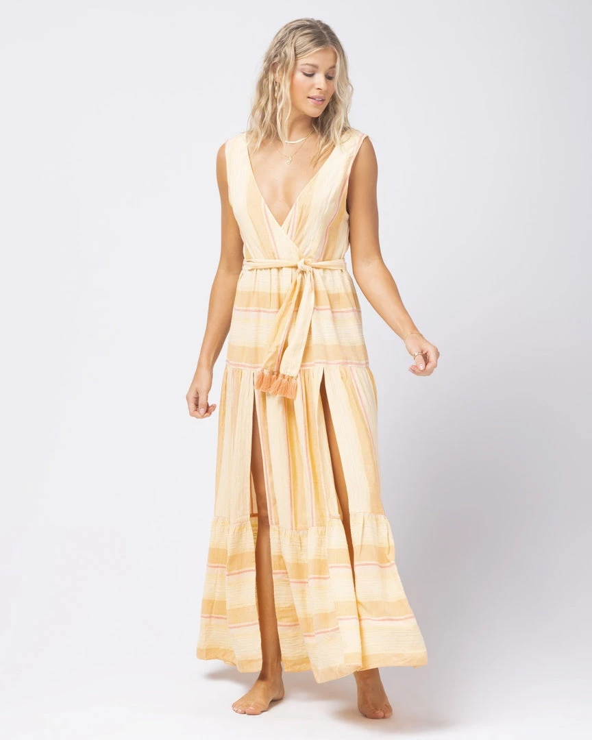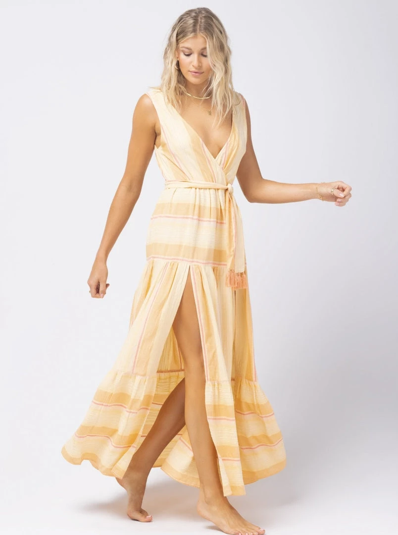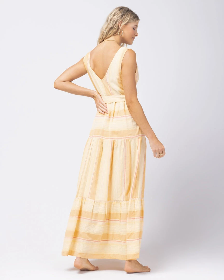 Deliciously light and airy, you’ll really be feeling yourself in the Clara Dress. Constructed from Cozumel Stripe yarn dye fabric, this maxi dress with a V neck front and back flows with a tiered skirt with slits and a removable belt with fringe trims on the ends.