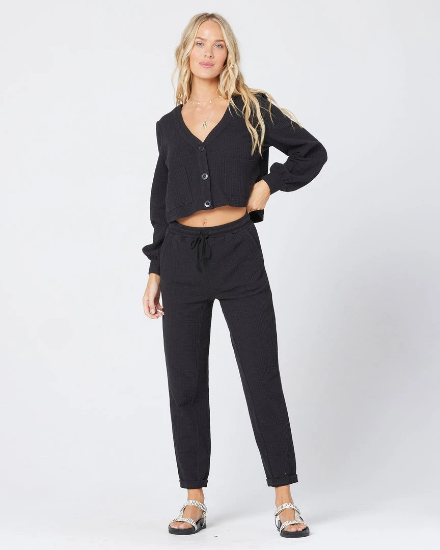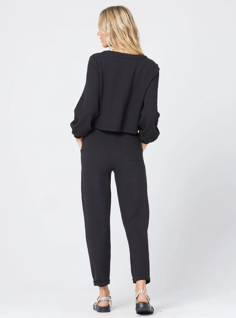 Terry cloth is back in a big way with the Dune Pant. These soft and cozy pants feature cropped + cuffed legs, an elastic waist with drawstring detail, and side slit pockets. Pair with the matching Romy Sweater for a seriously cozy look.
