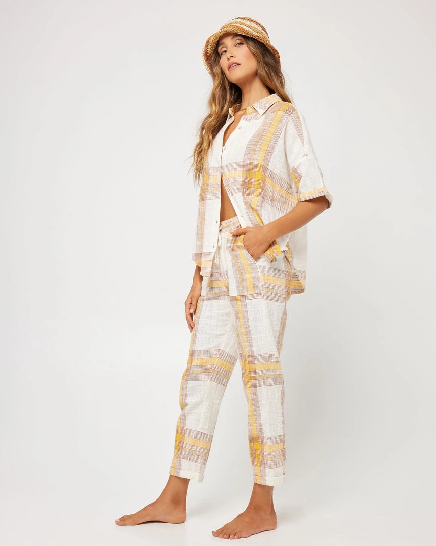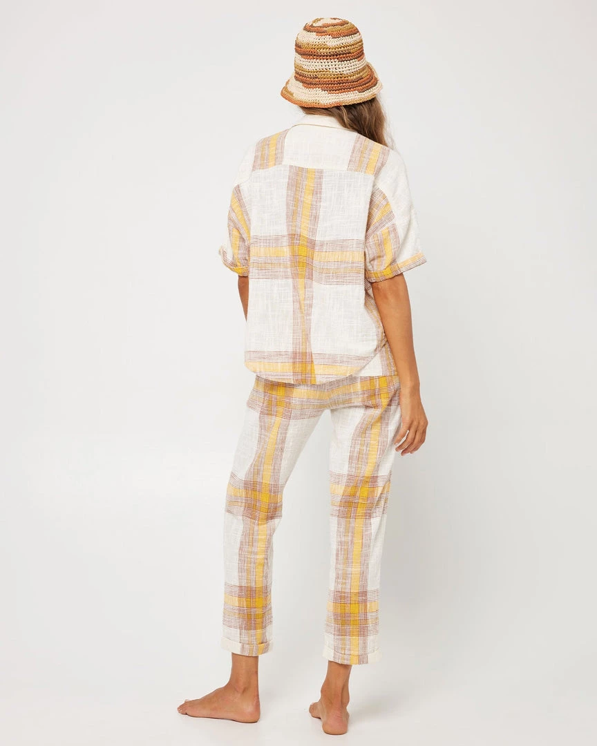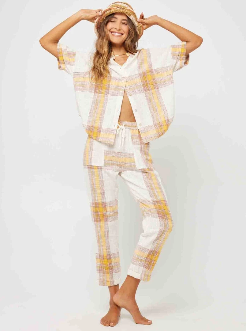 Keep the vibes light with the Isle of the Sun Pant. Constructed from plaid fabric, these cropped pants with tapered leg feature patch pockets on the front and back and a braided cord drawstring detail.
