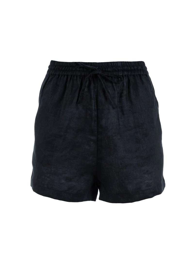 The Donovan Short is an elastic waist pull-on short. Side pockets feature a drawstring tie closure. The Donovan Short is styled here with the co-ordinating Lila Bralette.