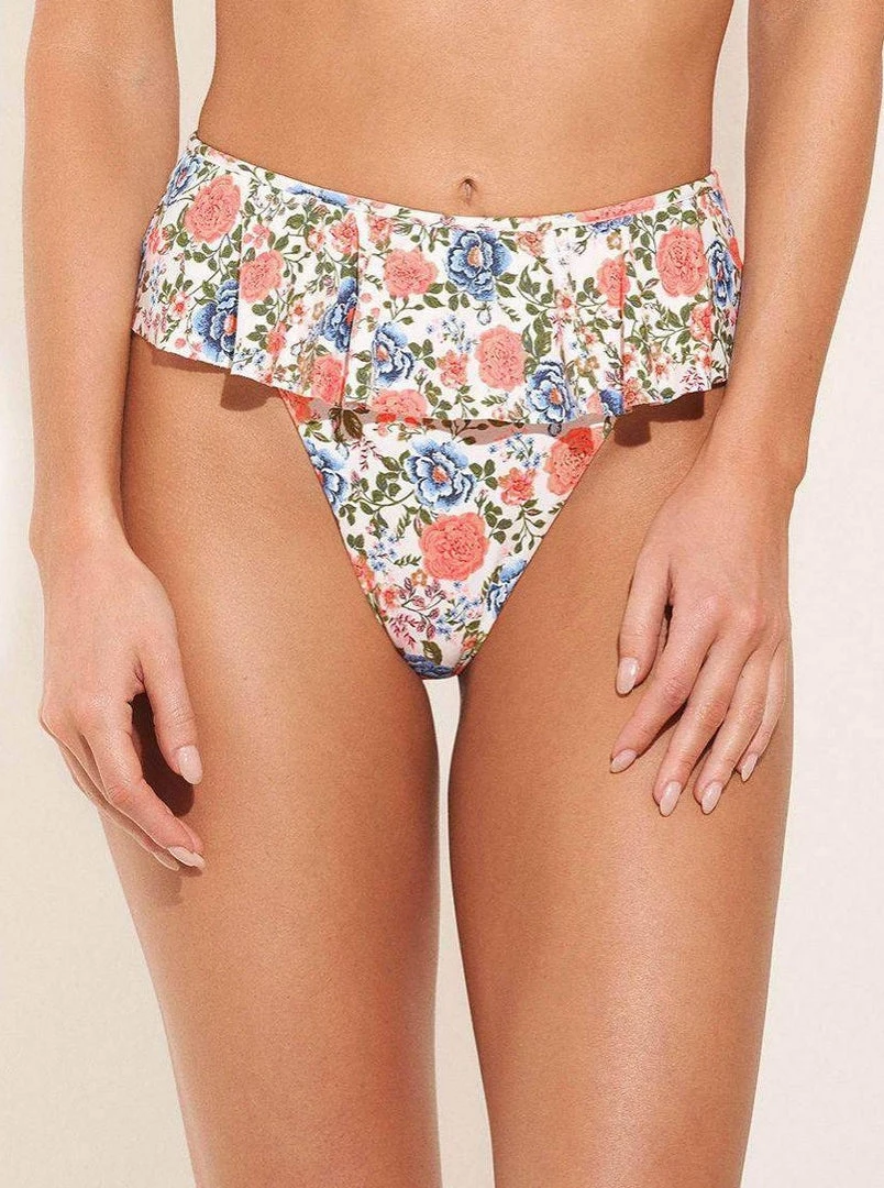 The Destiny bikini bottom high rise and high leg cut accentuate your best assets this summer. With the ruffle detail, you will be wearing a poetic that will bring out your romantic side.