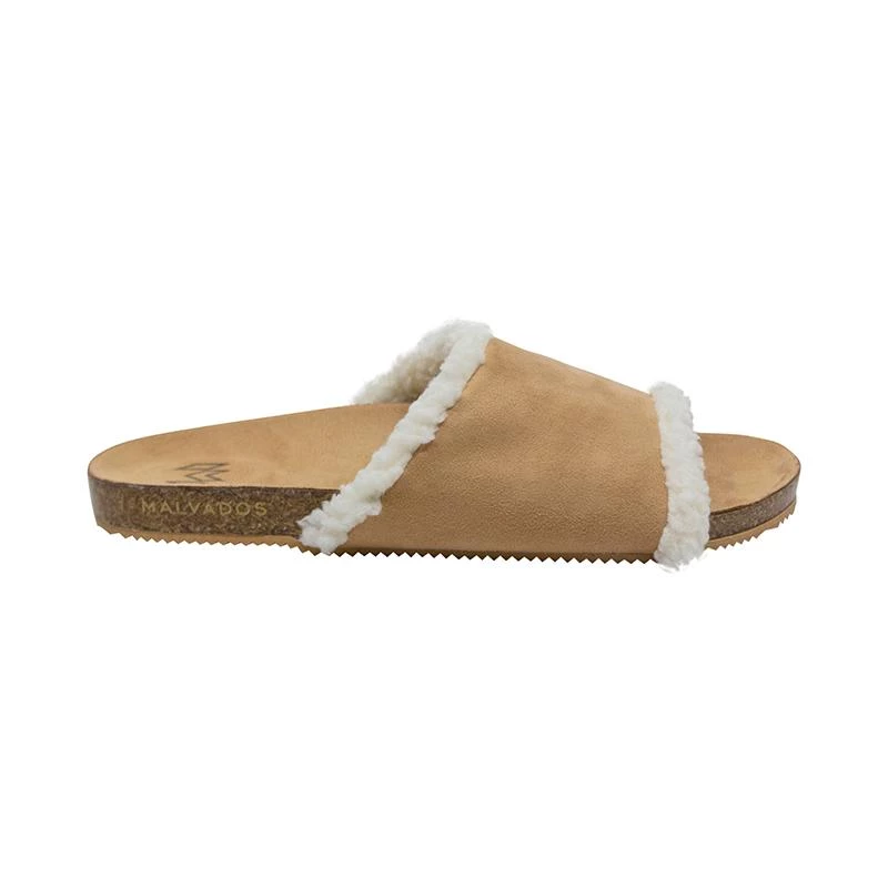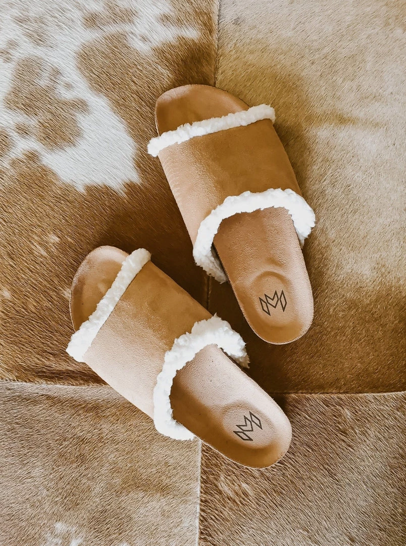 Our new faux microsuede shearling slide. Made with a supportive molded cork foot bed and a double sided faux fur lined upper. This slide is designed to mold and cradle your foot in comfort.