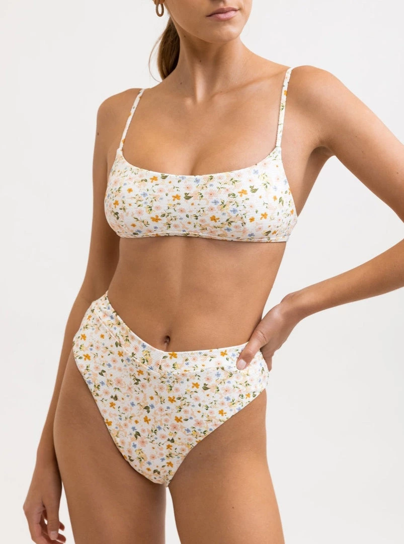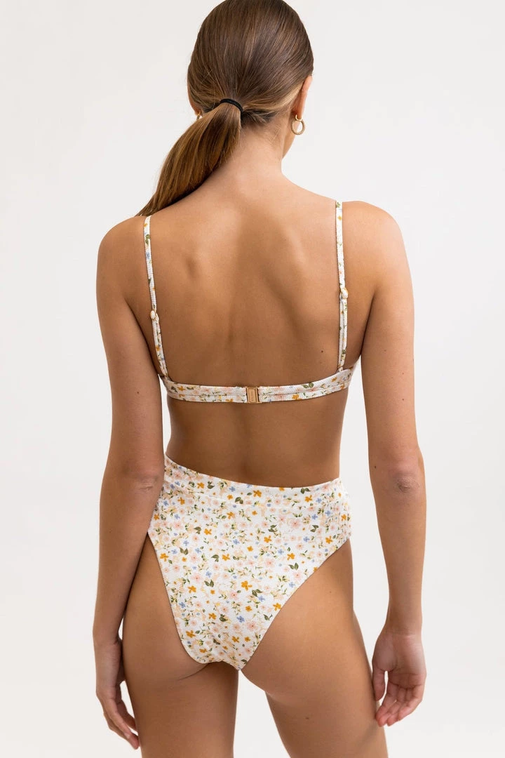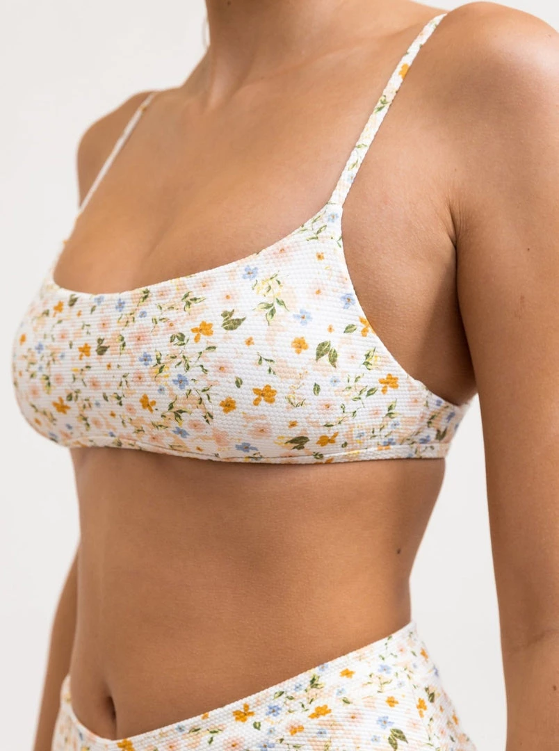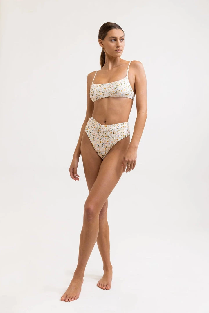 Crafted from eco-friendly recycled yarns, the Lavinia Crop Top is inspired by the playful nomad in every woman. A Peach Parfait palette of dreamy femme florals with supporting side seam boning, perfect for sunshine explorations. Complete this look with our matching Lavinia Bottom.