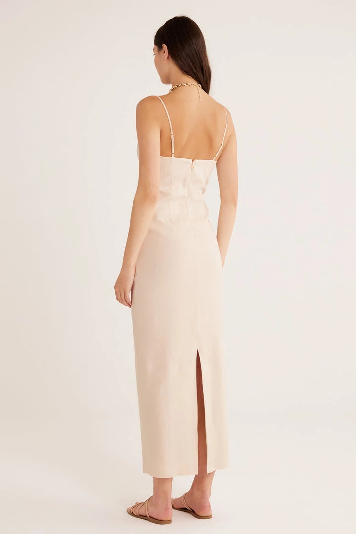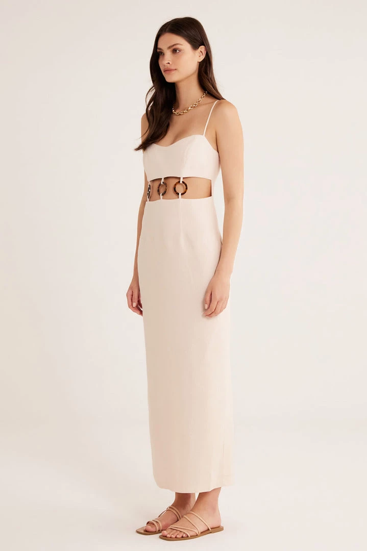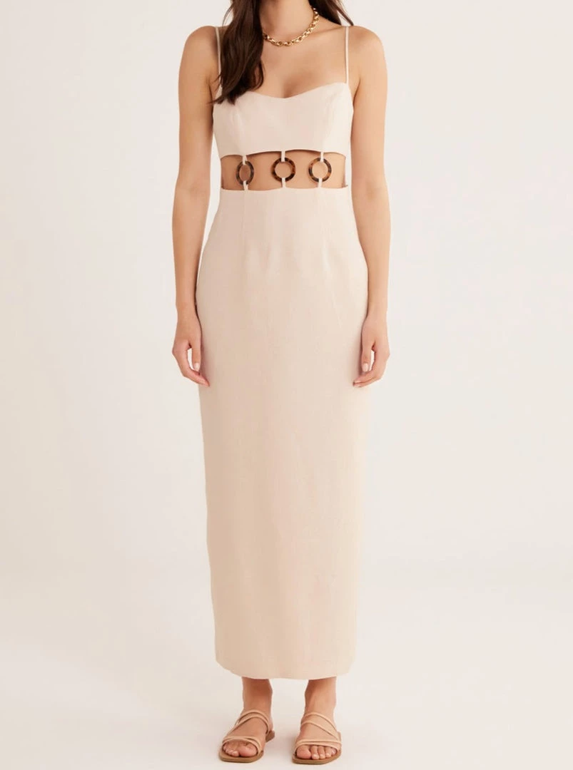 Simple column silhouette maxi dress with tortoiseshell rings at front. Fully lined.