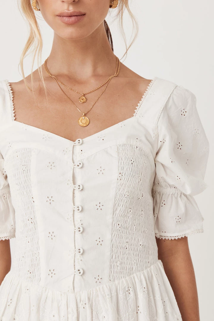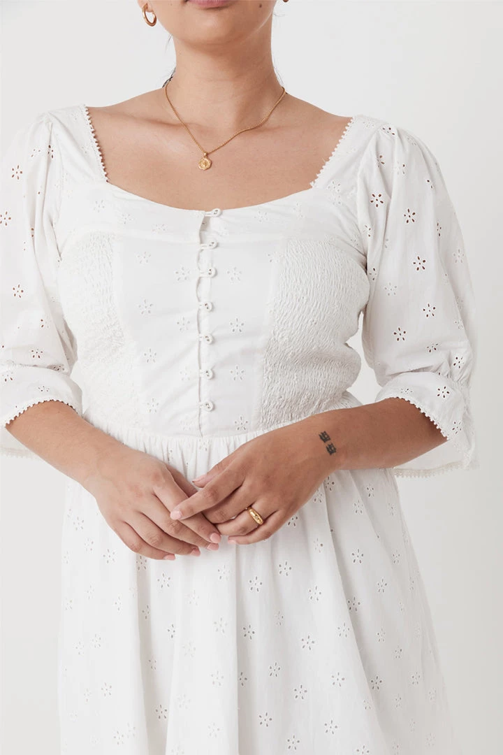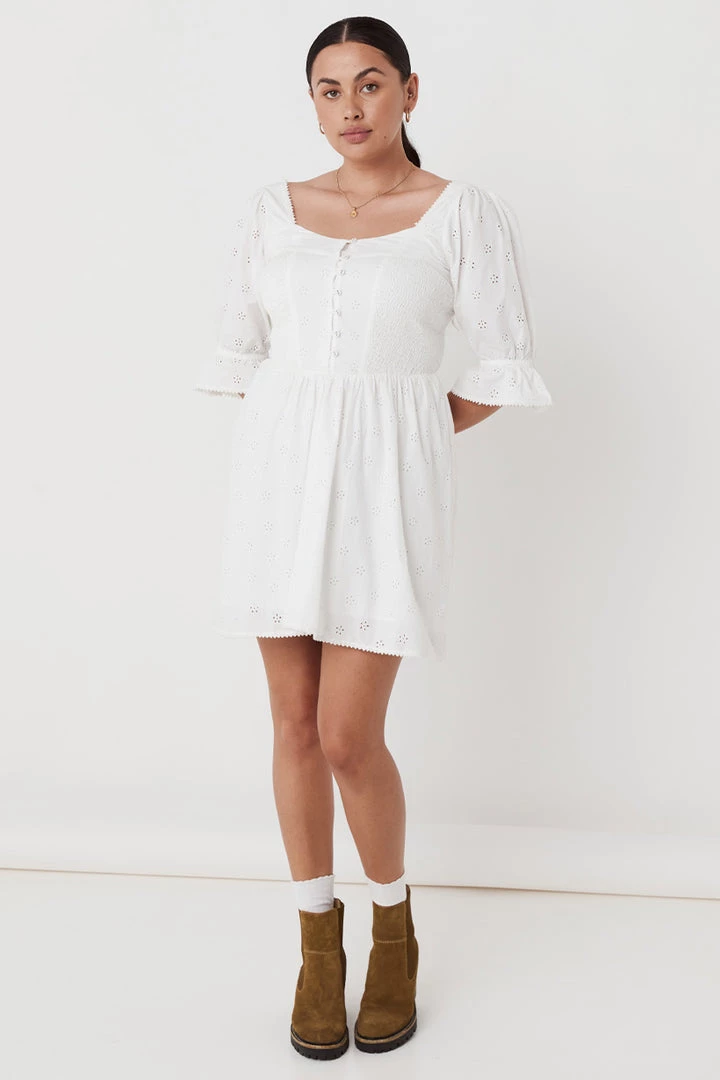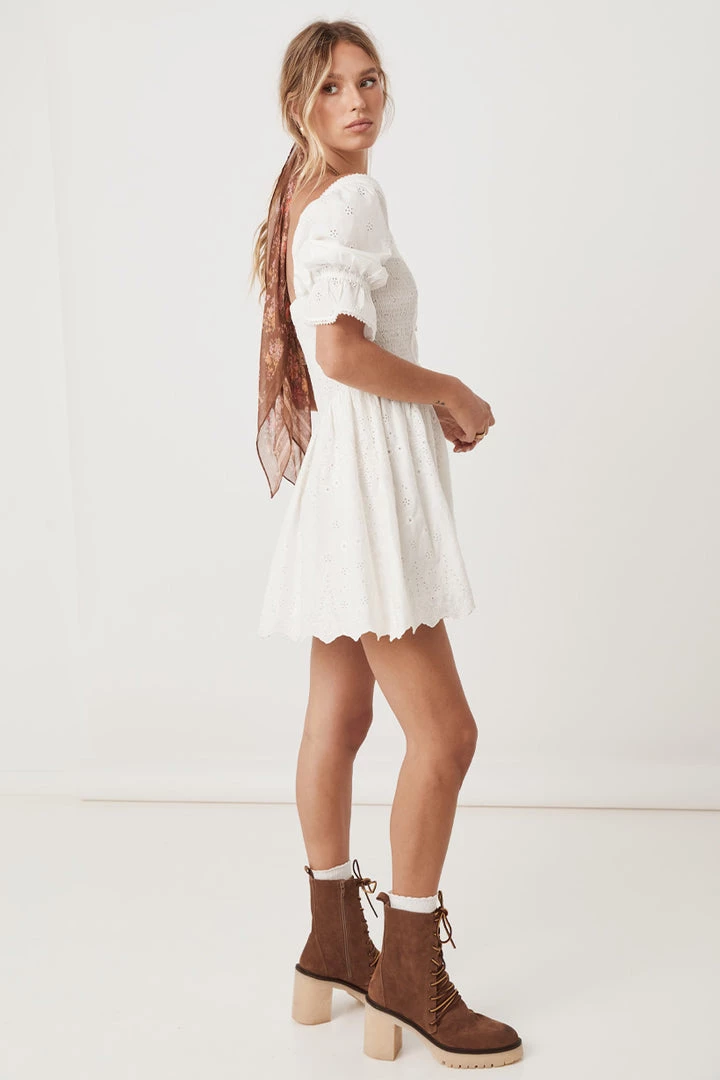 Edwardian inspiration meets white-flowering-field-of-our-dreams for a beautiful exploration of our ‘Bo’ Story. The Bo Mini Dress features tiny starburst daisies delicately embroidered across crisp organic cotton broderie anglaise. This mini has a shirred, shaped bodice designed to accentuate the female form. With a crisp yet soft hand feel, this dress is every modern romantics fantasy piece.