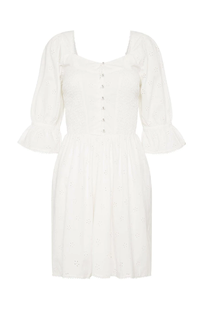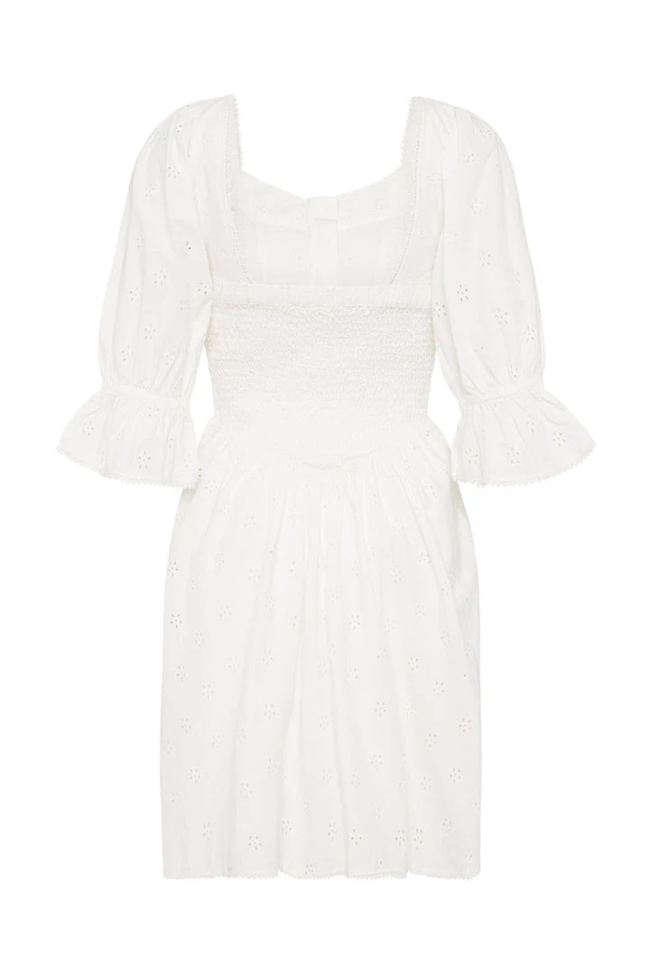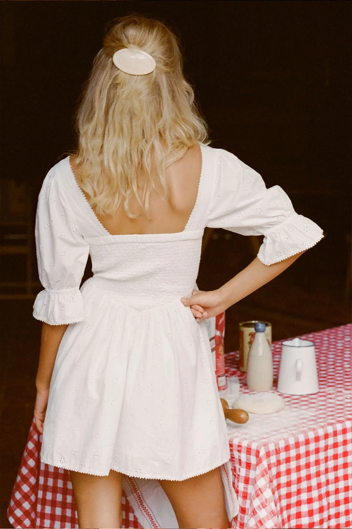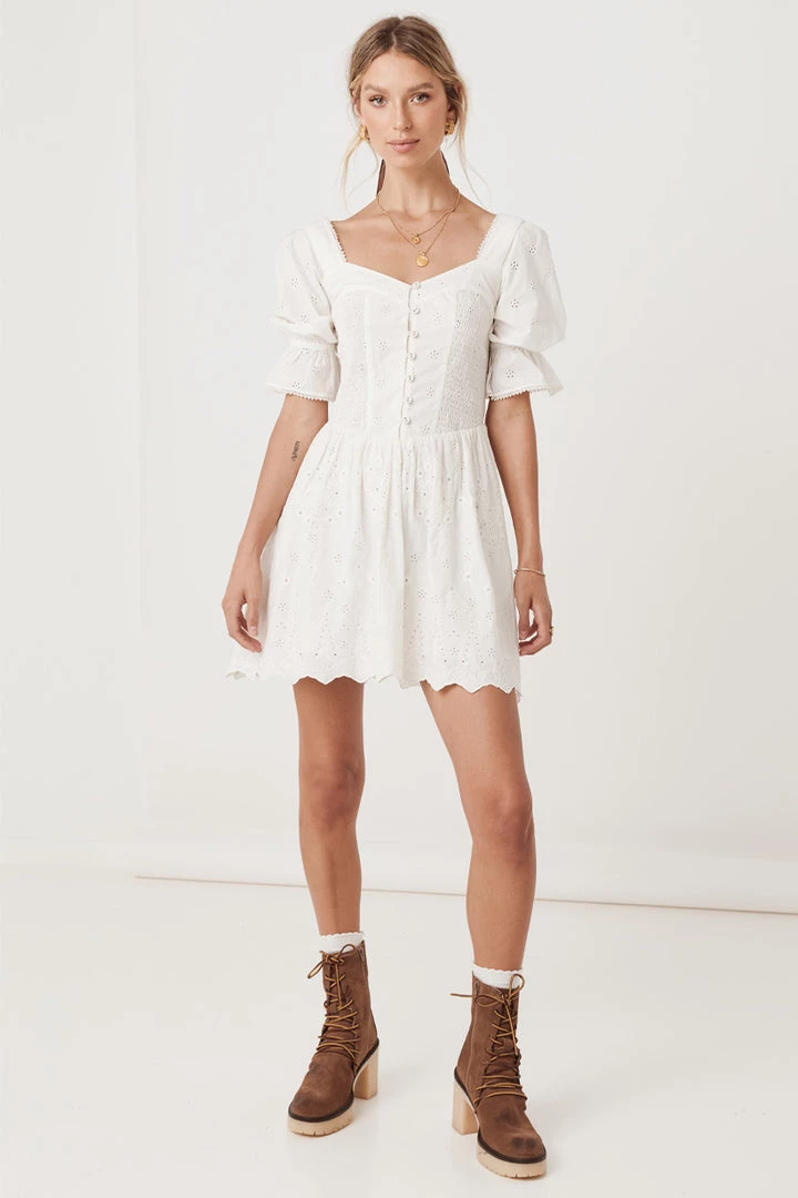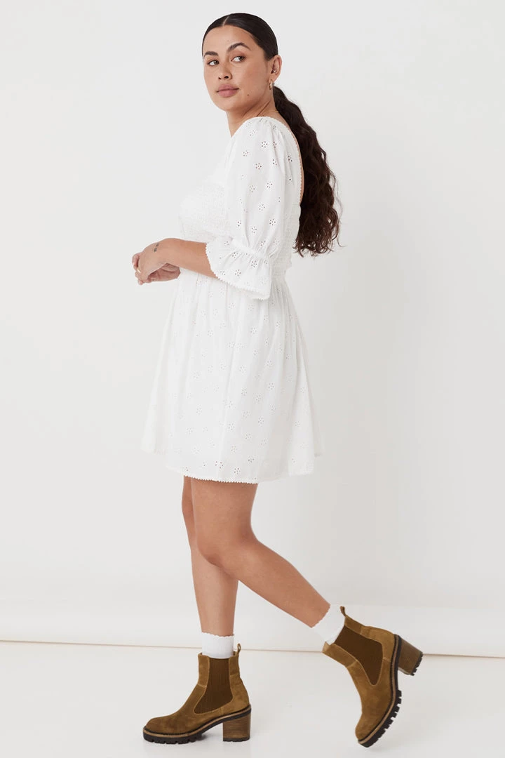Edwardian inspiration meets white-flowering-field-of-our-dreams for a beautiful exploration of our ‘Bo’ Story. The Bo Mini Dress features tiny starburst daisies delicately embroidered across crisp organic cotton broderie anglaise. This mini has a shirred, shaped bodice designed to accentuate the female form. With a crisp yet soft hand feel, this dress is every modern romantics fantasy piece.