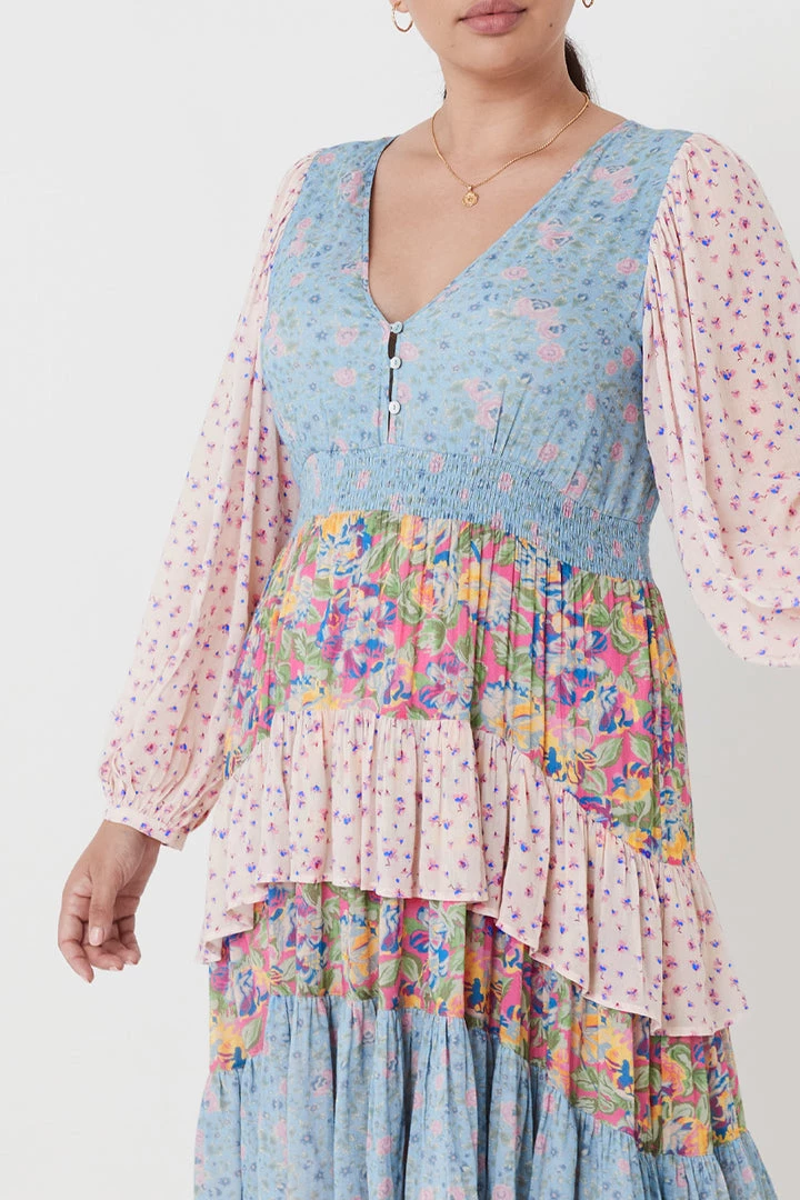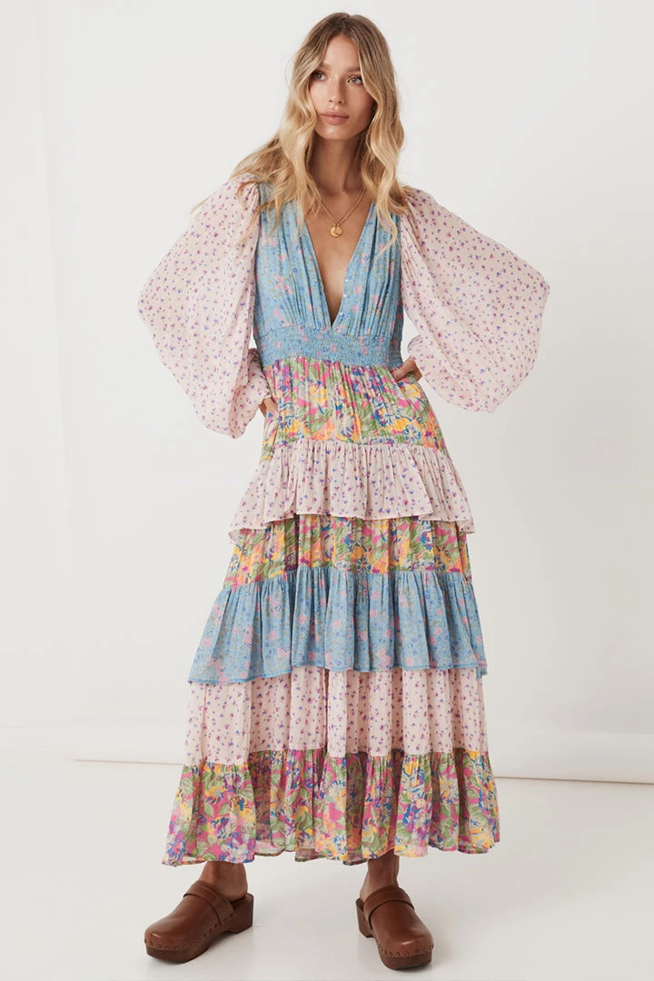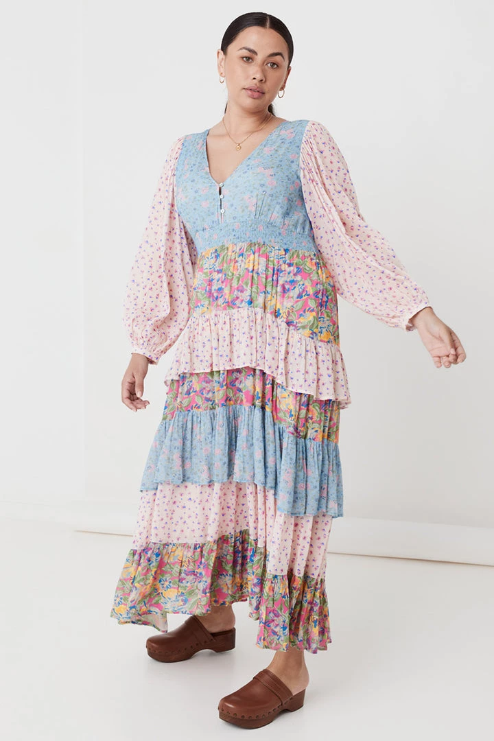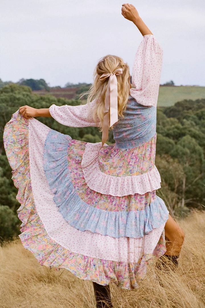 This incredible gown is what Spell dreams are made of, introducing the Dolly Ra-Ra Gown. This stunning new style is the result of yet another ‘Spelly gone rouge’ moment and we are so happy she did! Our design team drew inspiration from the nostalgia of eras past for this stunning style. A cut and sew patchwork of three contrasting floral yardages, billowing sleeves, a plunging V neckline leading into a shirred waist and voluminous skirt of layered frills and gathers. For the Dolly Ra-Ra Gown, more is more and less is simply not an option!