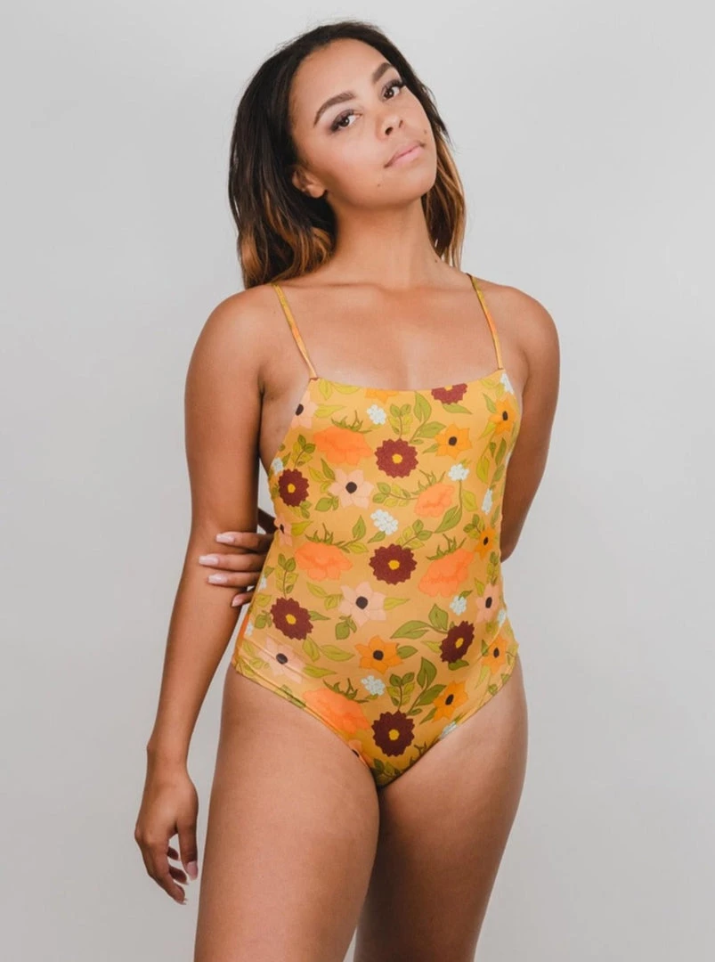 Straight across cut on the chest. Adjustable straps and cheeky coverage.