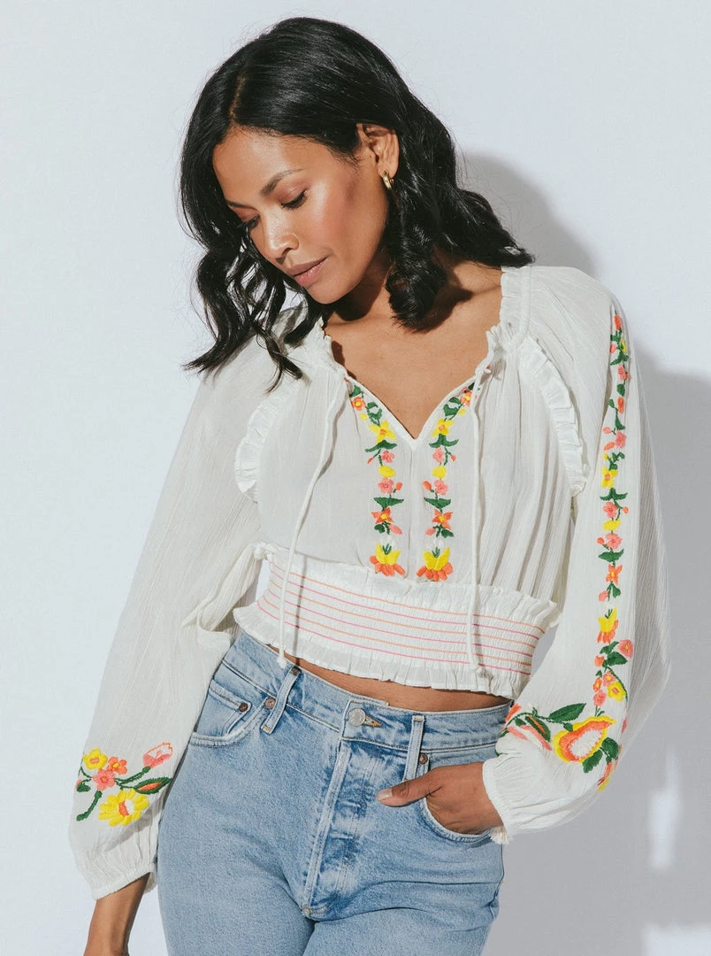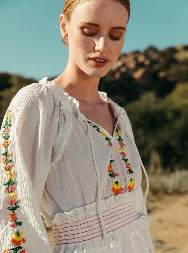 Made of 100% GOTS organic cotton, the Nyla Blouse is a great transitional piece for Summer. Beautiful embroidery detail, and easily worn throughout the day and into the night.Â