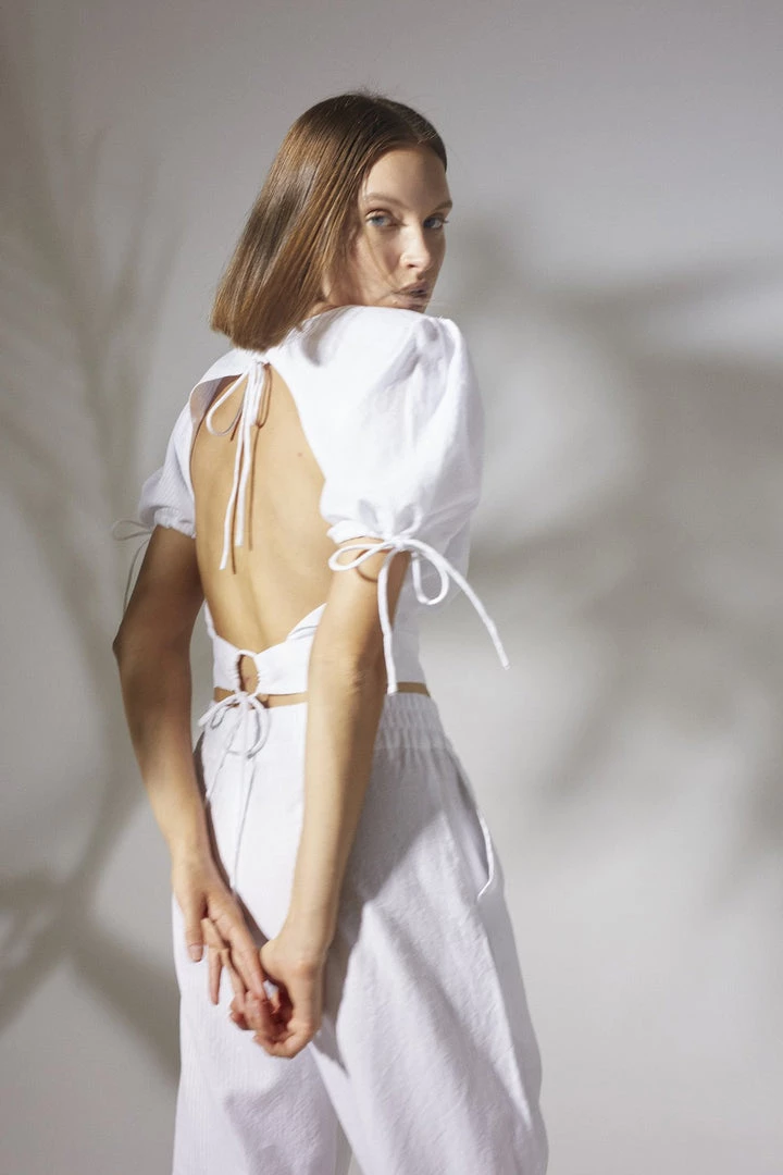 Featuring a raised neckline, open back detailing with neck and back ties, and short balloon style sleeves, our Kiana top is a must have.