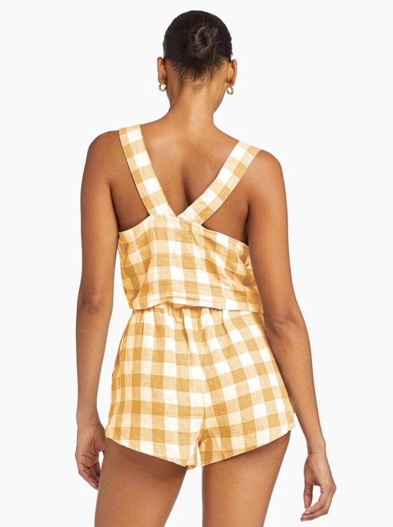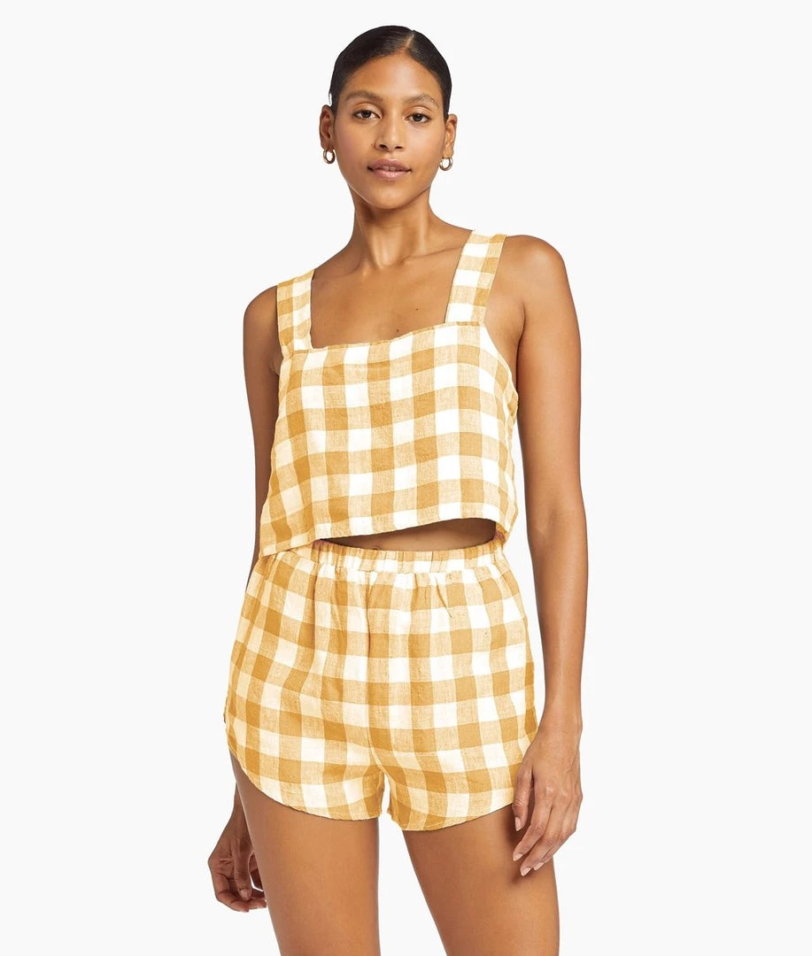 From the top. Wide criss-crossed straps, darts at the bust, and a straight décolletage for a modern fit.